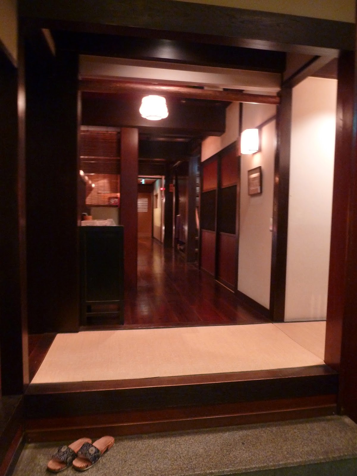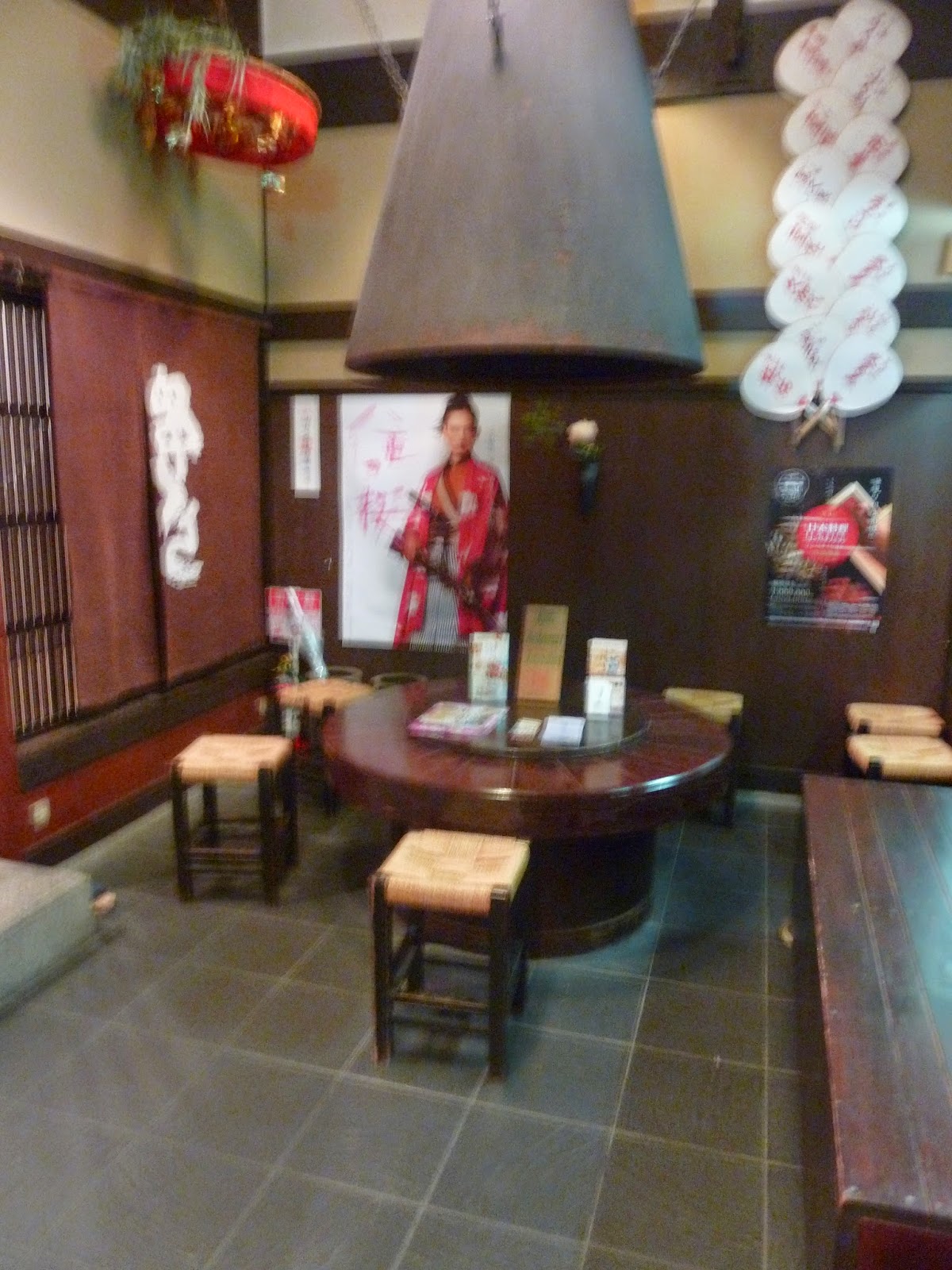 Au fond :  se trouve un accueillant restaurant aux baies vitrées où il faut se déchausser avant de prendre place, sur les tatamis posés au sol, autour de petits foyers sur lesquels seront plus tard posés les pots contenant la soupe.