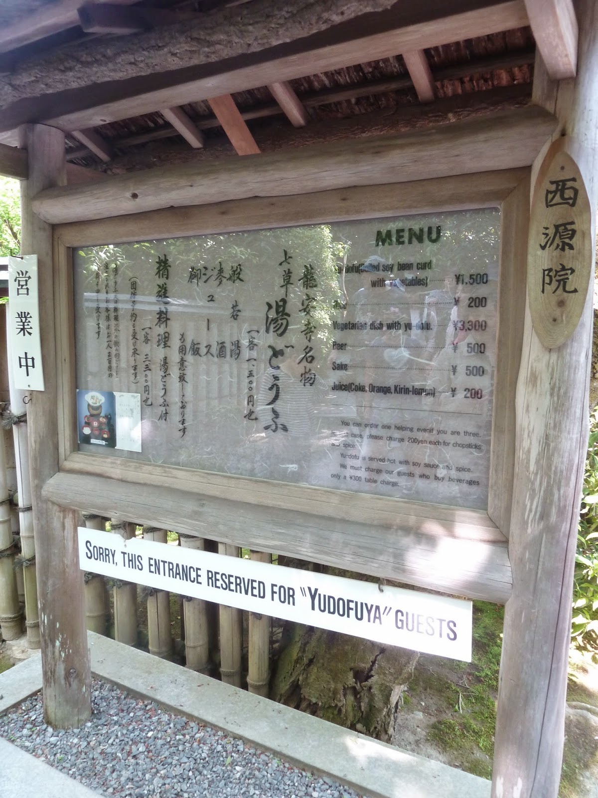 Au milieu de ma visite du temple zen de Ryoan-ji, (Rock Garden) j’ai eu l’agréable surprise de passer devant un restaurant, le Yudofuya, spécialisé dans le tofu, (sorte de fromage de soja) dont la porte d’entrée m’a intriguée !