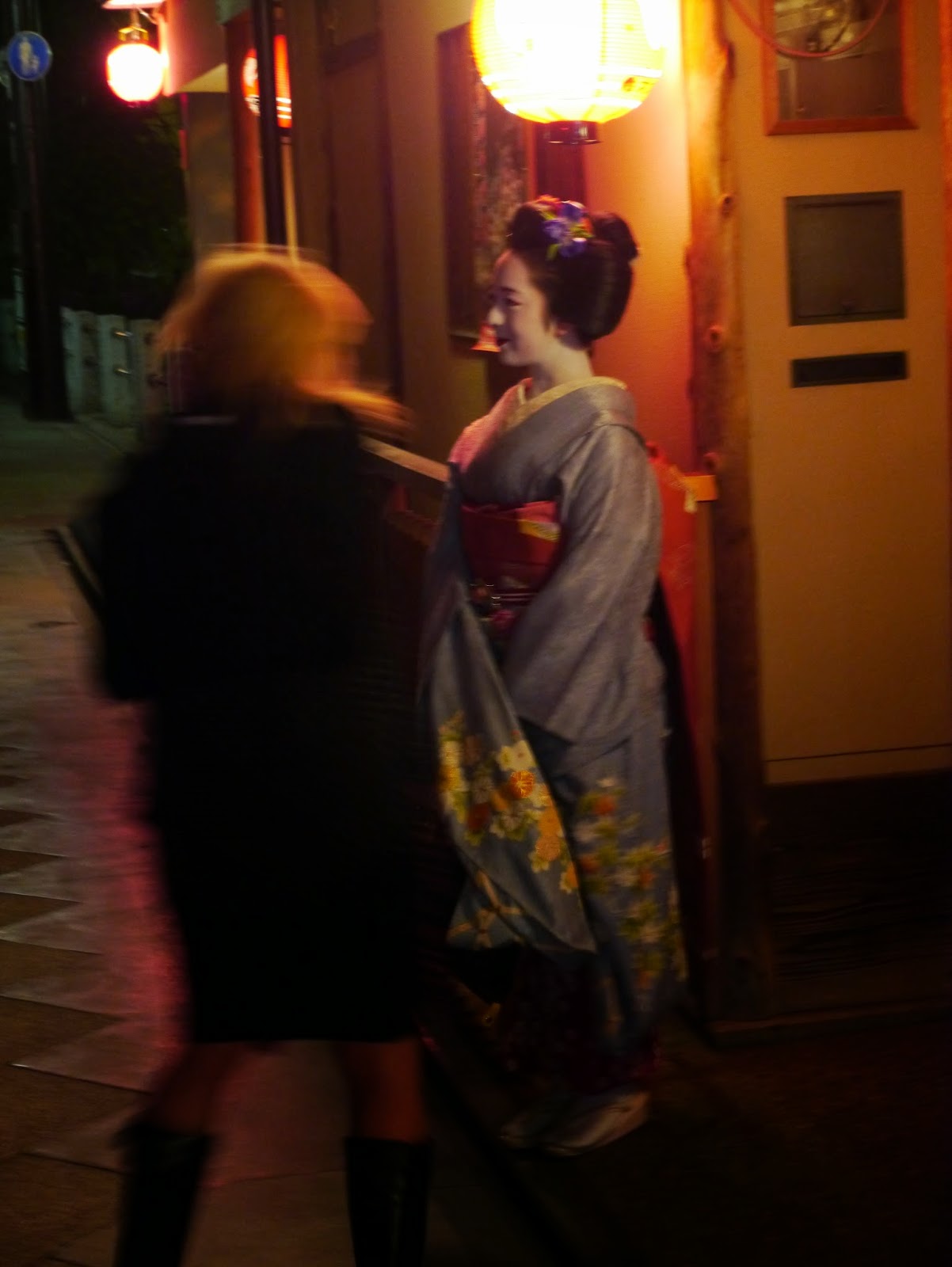 Aujourd’hui, même dix huit mois après mon séjour  Kyoto, je ne sais quel mot employer pour décrire au plus juste la sensation que j’ai ressenti lorsque je me suis retrouvée, un soir du mois de mai 2013 aux alentours de 23 heures, à quelques mètres d’une , puis de plusieurs geishas à Pontocho !