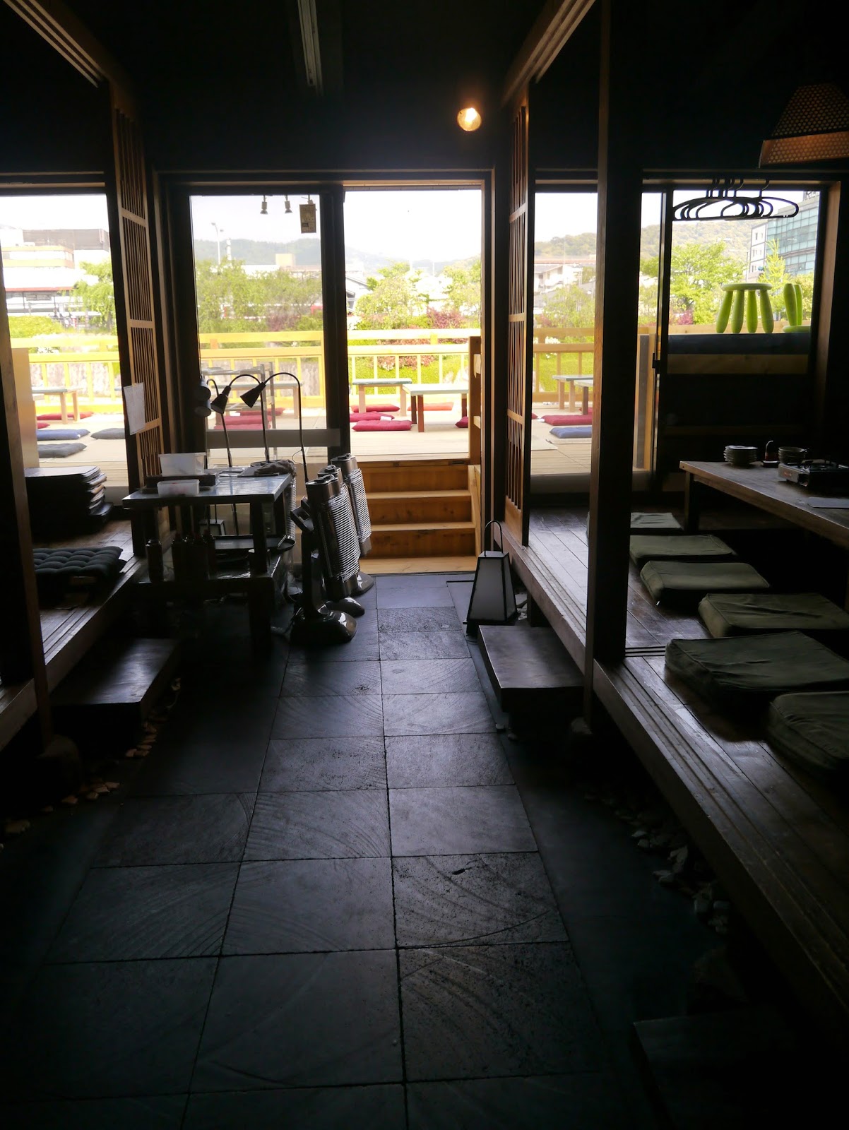 Au fond :  se trouve un accueillant restaurant aux baies vitrées où il faut se déchausser avant de prendre place, sur les tatamis posés au sol, autour de petits foyers sur lesquels seront plus tard posés les pots contenant la soupe.