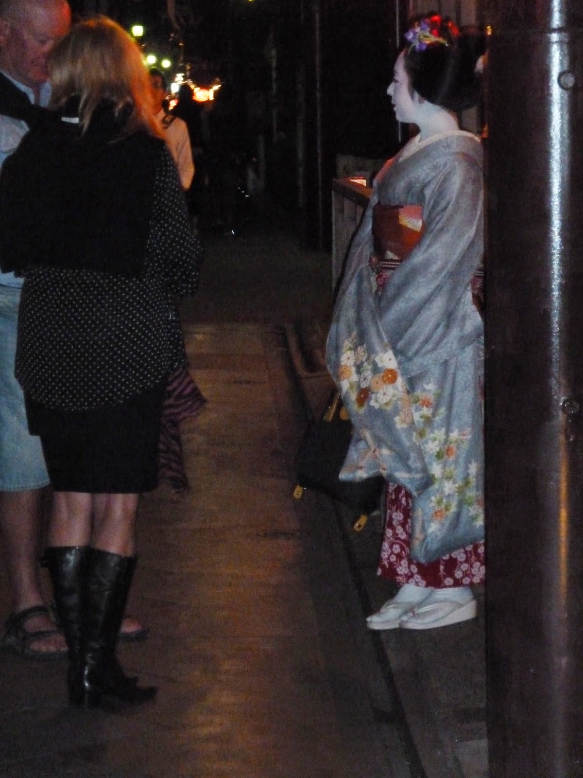 Aujourd’hui, même dix huit mois après mon séjour  Kyoto, je ne sais quel mot employer pour décrire au plus juste la sensation que j’ai ressenti lorsque je me suis retrouvée, un soir du mois de mai 2013 aux alentours de 23 heures, à quelques mètres d’une , puis de plusieurs geishas à Pontocho !