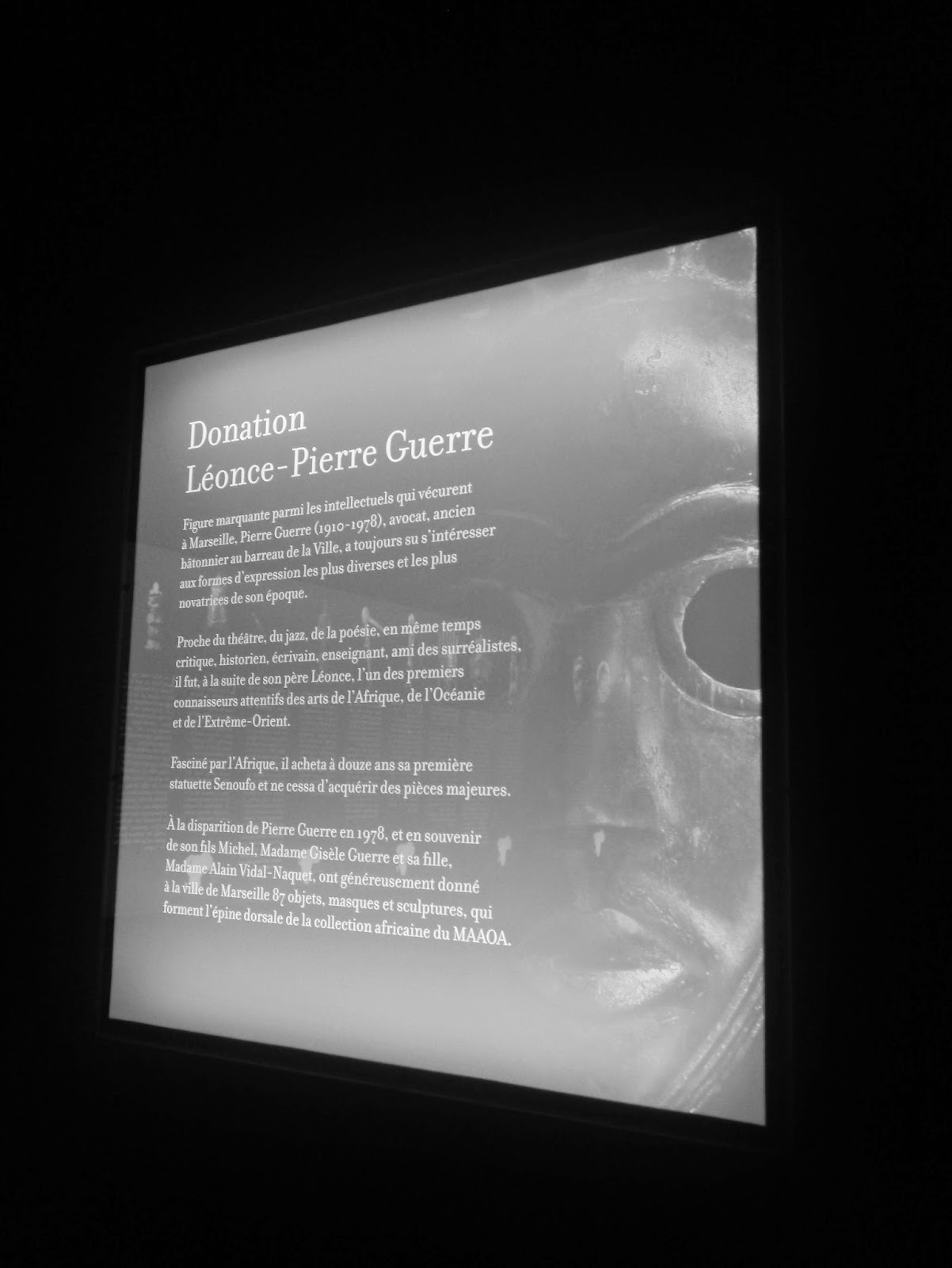 Ces pièces, notamment masques Fang, Baoulé,Yuruba ou Guéré, datant du 19 et 20 eme siecles sont, pour la plupart, issues de la donation de la famille Léonce et Pierre Guerre, des passionnés marseillais, du 20 ème siècle, d’objets africains.