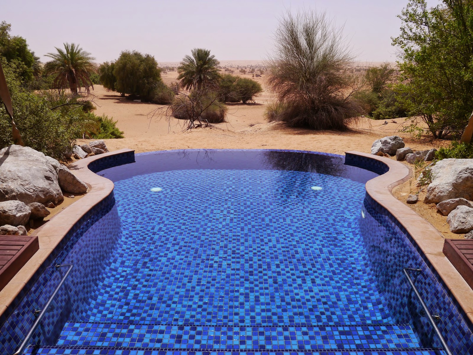 Mais le clou du spectacle se situait à l’extérieur de la chambre : une piscine privative à débordement, réglable à la température souhaitée et éclairée la nuit, faisant face aux dunes du désert !