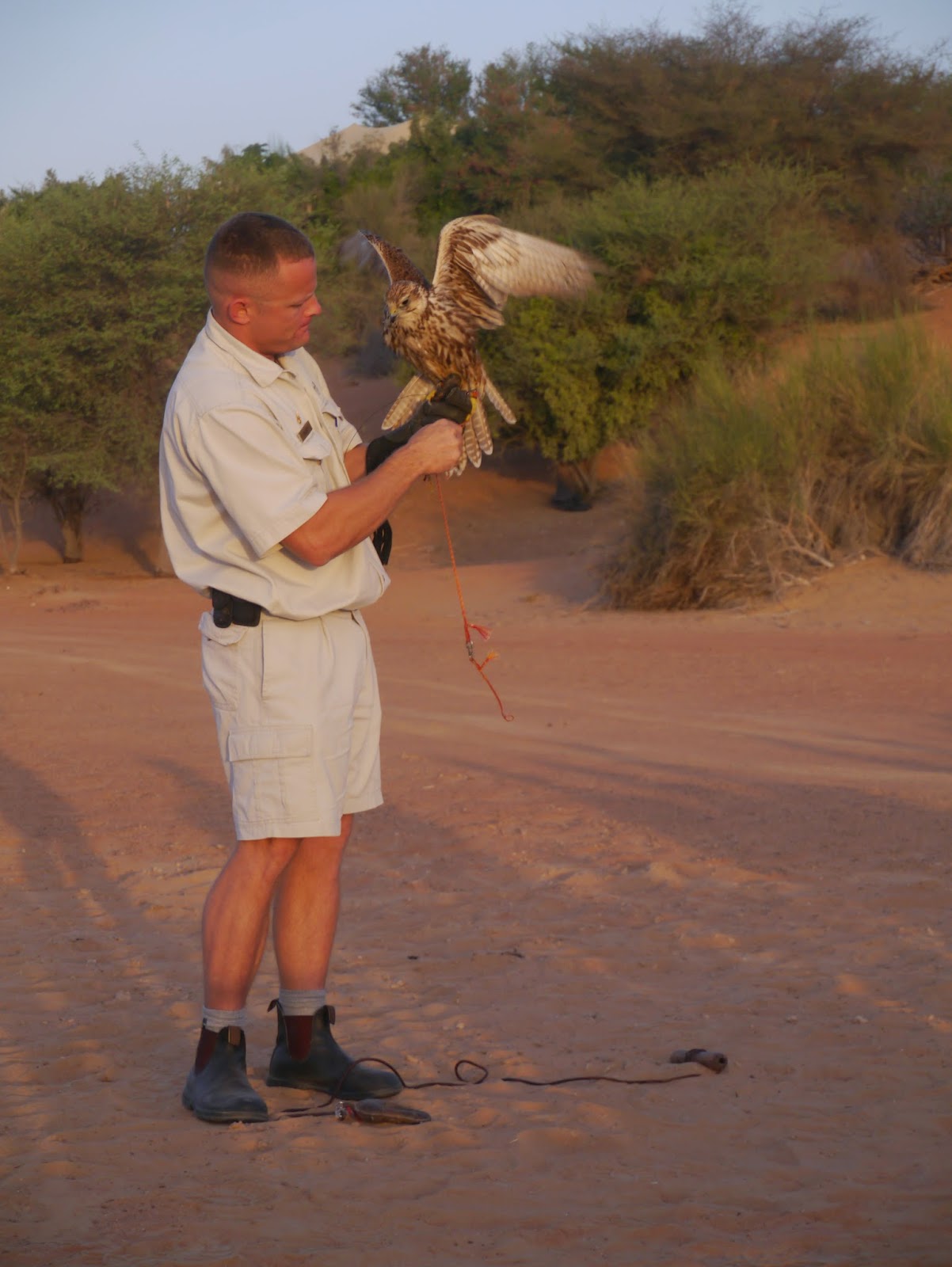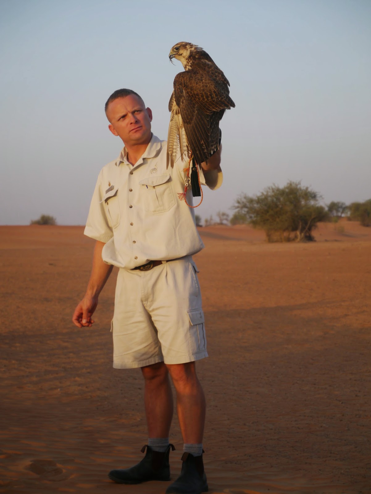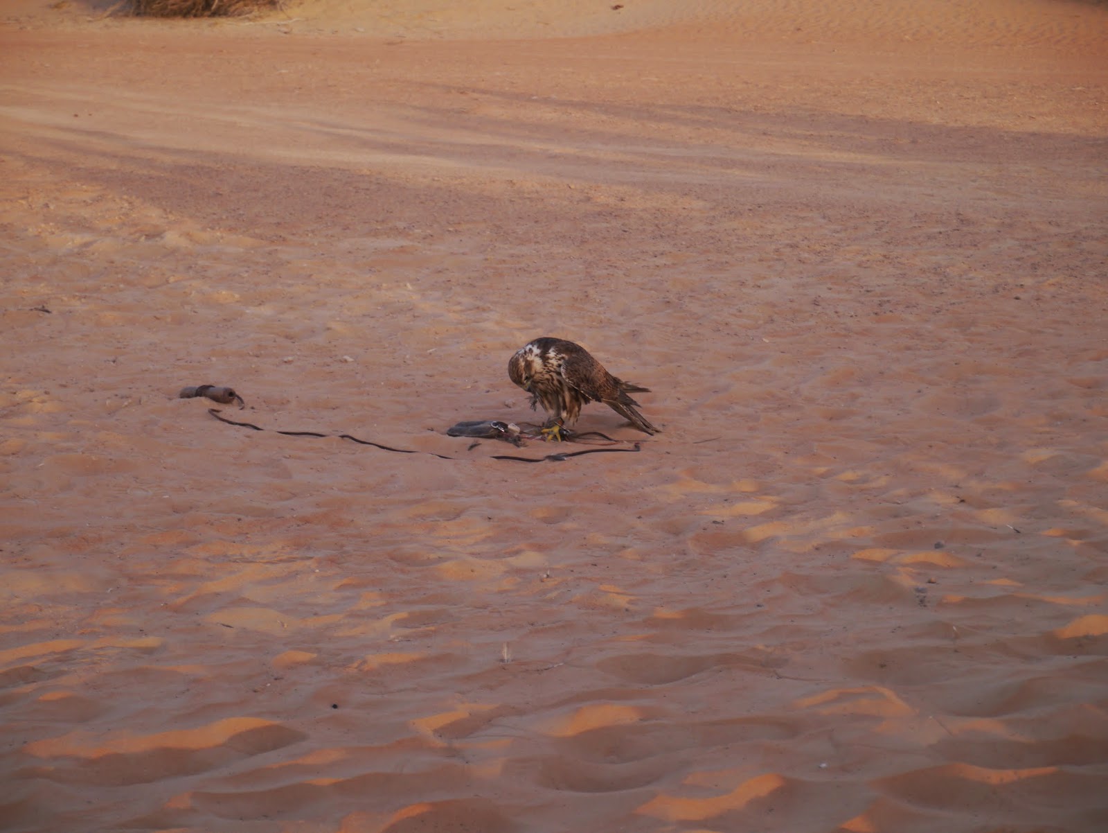 Le lendemain matin, aux aurores soit aux alentours de six heures du matin, (car les rapaces ne supportent pas la chaleur) j’ai découvert, en une heure, une activité prisée des bédouins, et des émiratis : le vol des faucons.