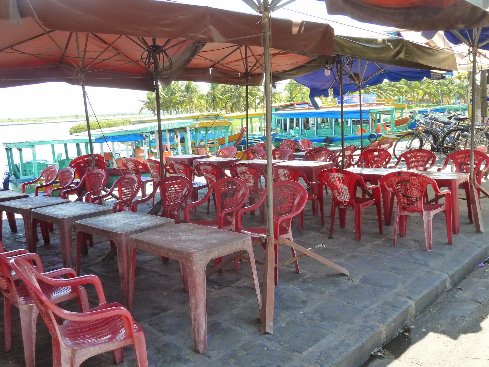 Le long des quais du fleuve,des restaurants avaient installé des chaises et tables en plastique où des clients terminaient leur repas en buvant leur jus de coco.