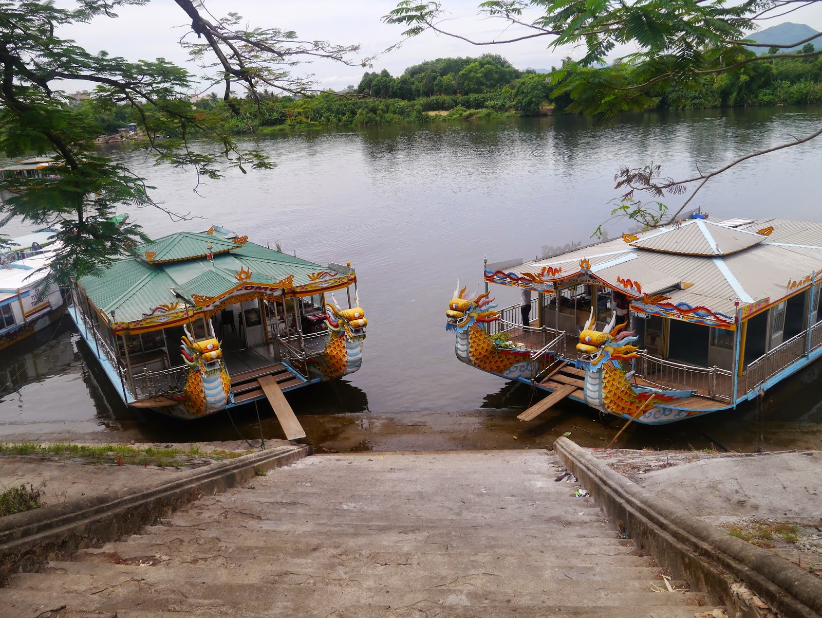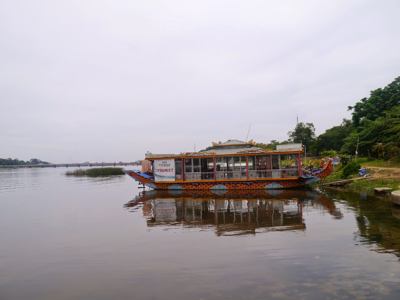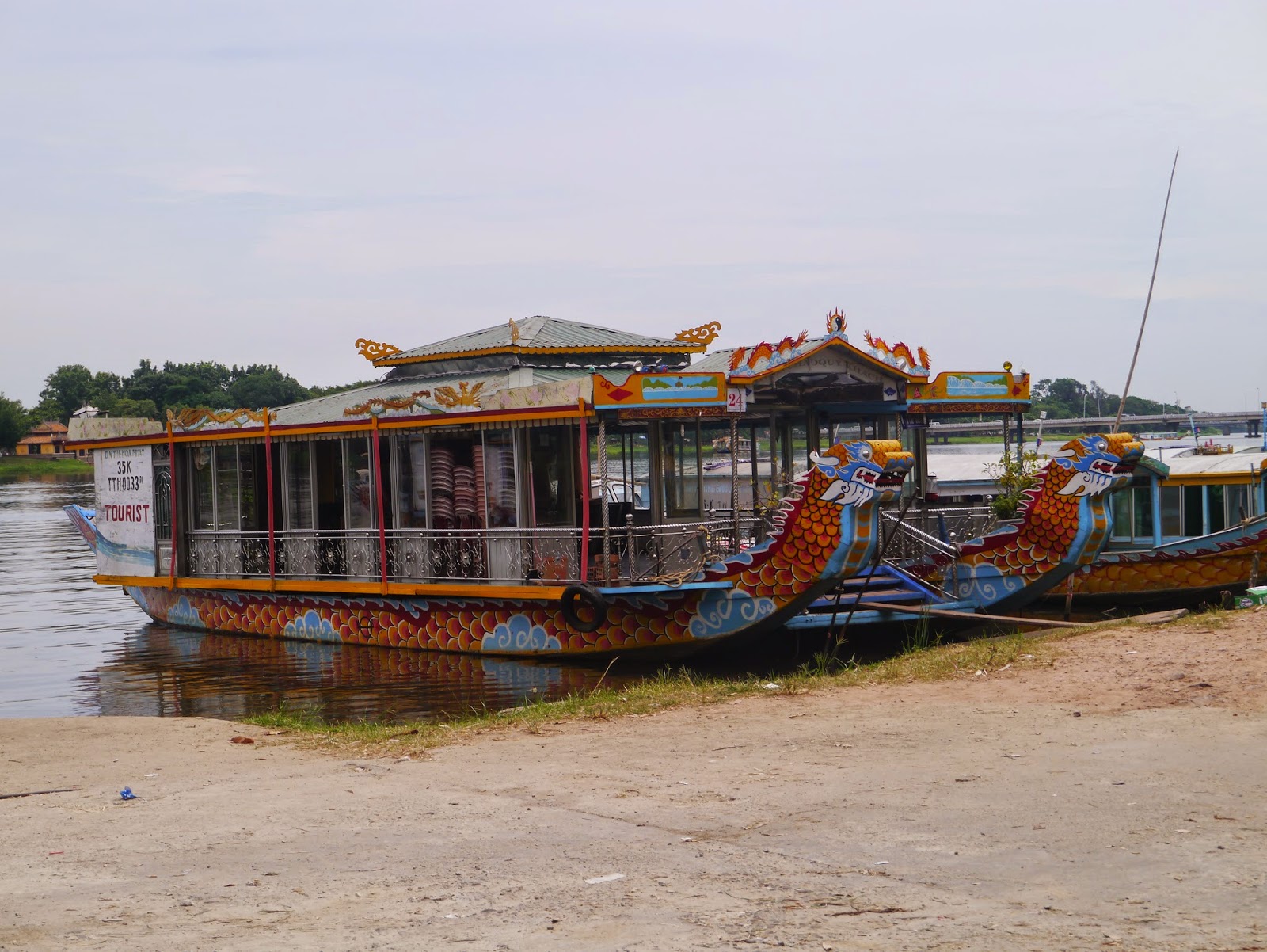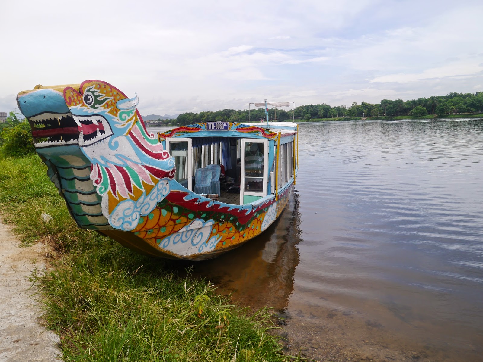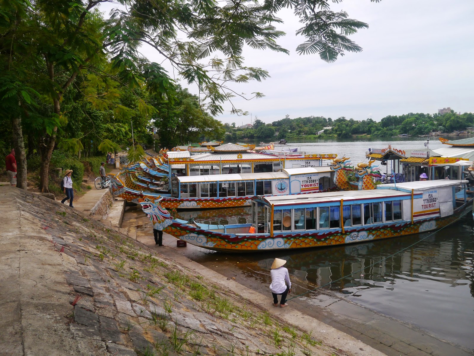 Stationnant le long de la berge, au pied de la Pagode de la Dame Céleste, il est IMPOSSIBLE de rater ces bateaux, hyper colorés, à tête de dragons !