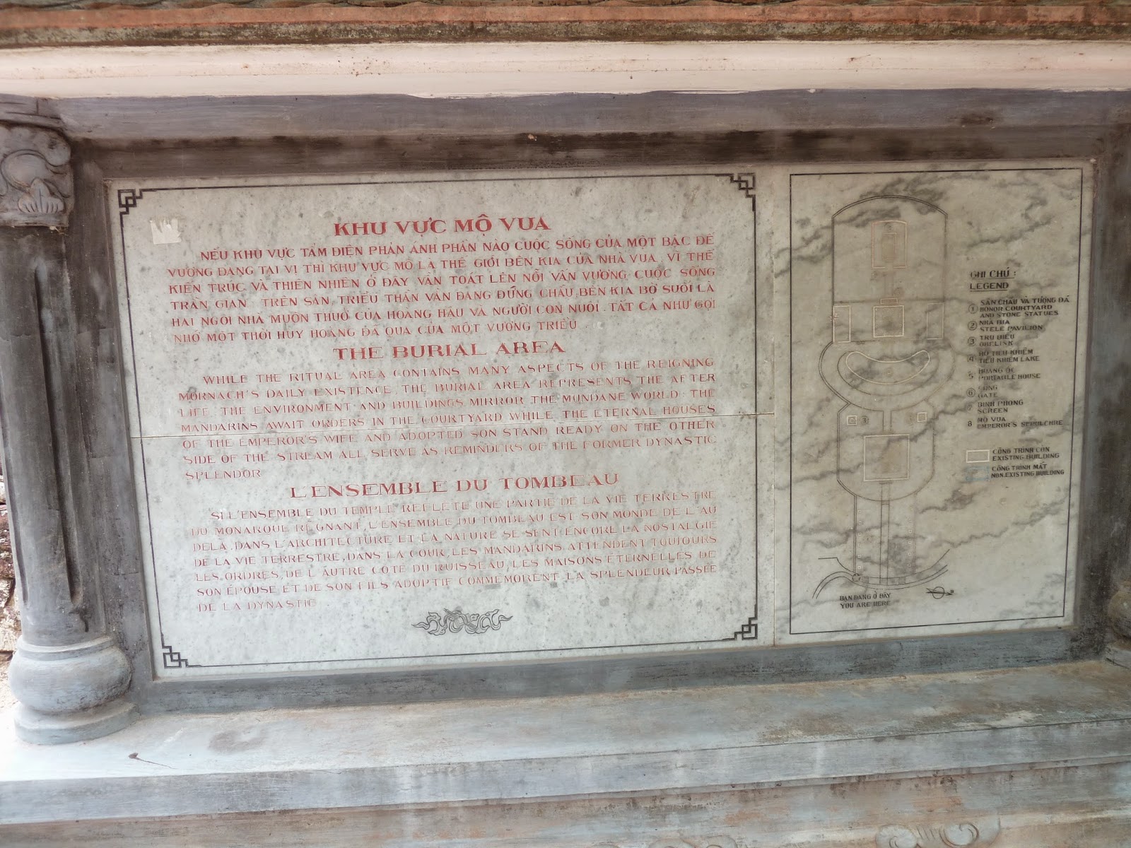 Mais, pour moi, leur attrait réside dans leur agencement architectural commun à savoir : un mausolée situé au cÅ“ur d’un parc, un temple, des stèles évoquant la vie de l’empereur, un jardin luxuriant, des plans d’eau ainsi qu’une grande cour des salutations comprenant des statues d’animaux( chevaux et éléphants) ainsi que des serviteurs ( mandarins civils et militaires) prêts à servir le disparu dans l’au-delà .