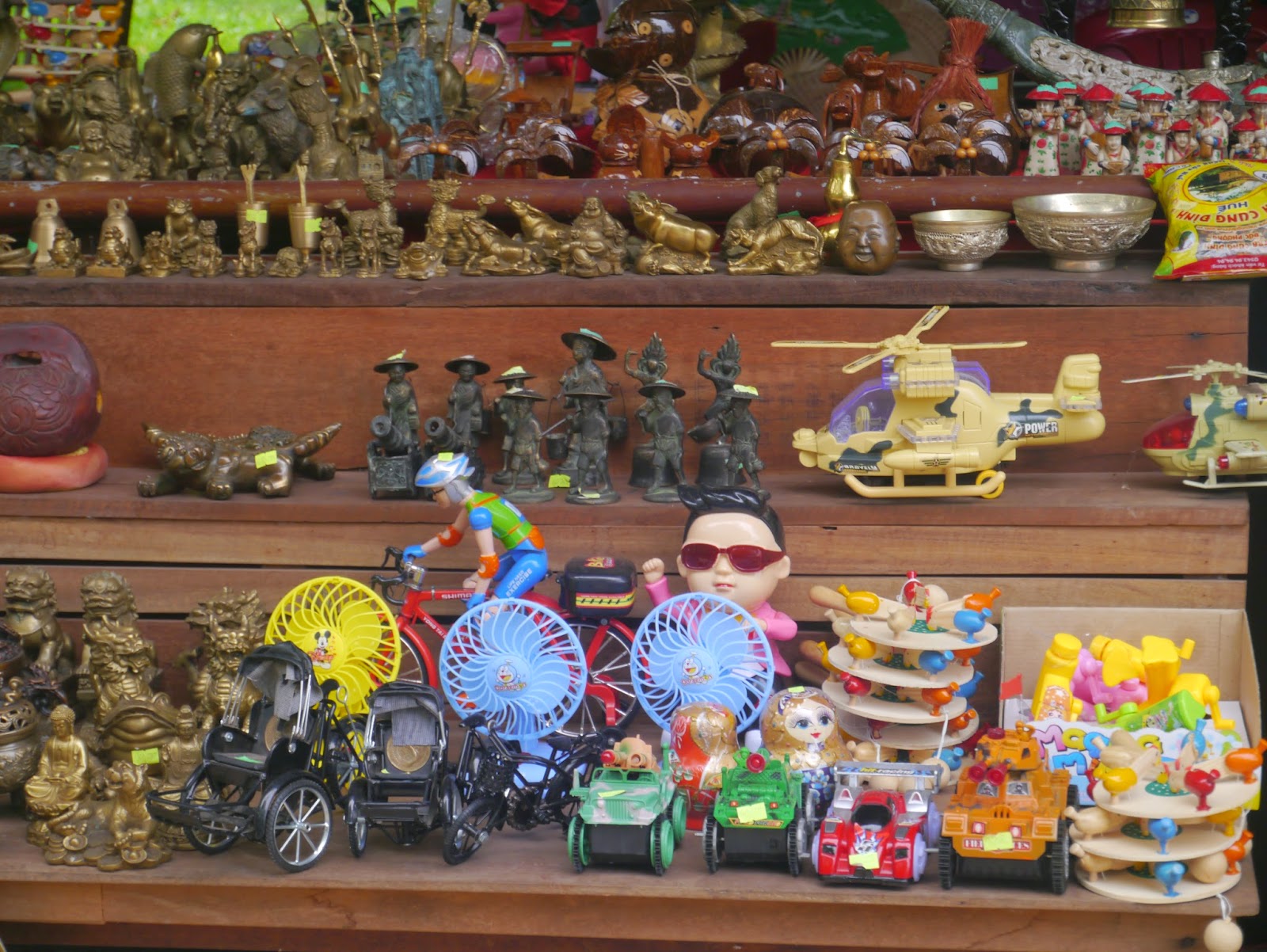 Ils vendent un peu tout, dont notamment des chapeaux coniques, l’un des symboles du pays comme je vous l’expliquais déjà ici et dont le berceau de création est à Hué, et n’importe quoi (ainsi des poupées à l’effigie de Psy, le créateur coréen de Gangnam Style côtoient notamment des bonbons à la menthe).