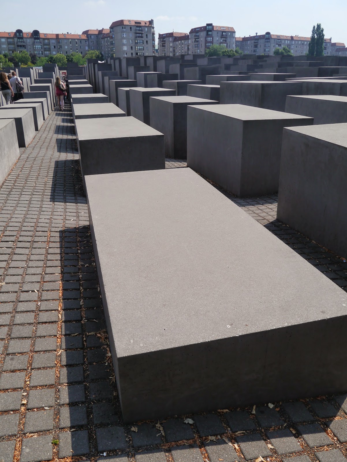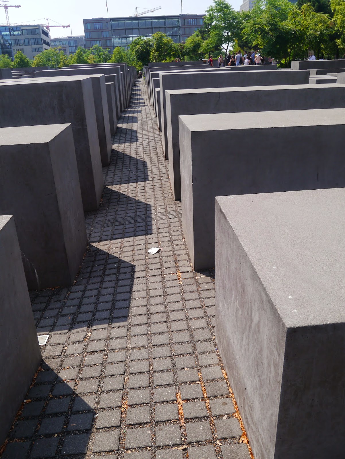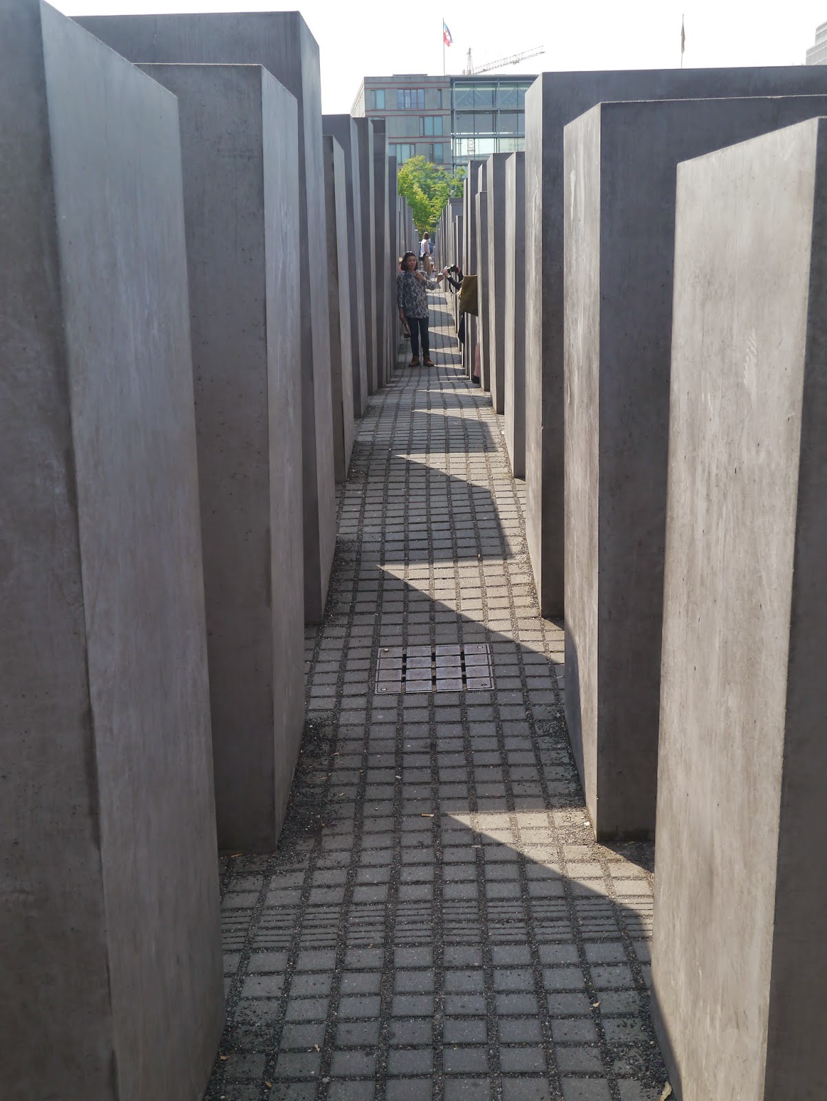 Un étroit labyrinthe,  composé de plus de 2000 stèles de différentes hauteurs naissant du sol, rend hommage à toutes les victimes européennes du génocide juif.
