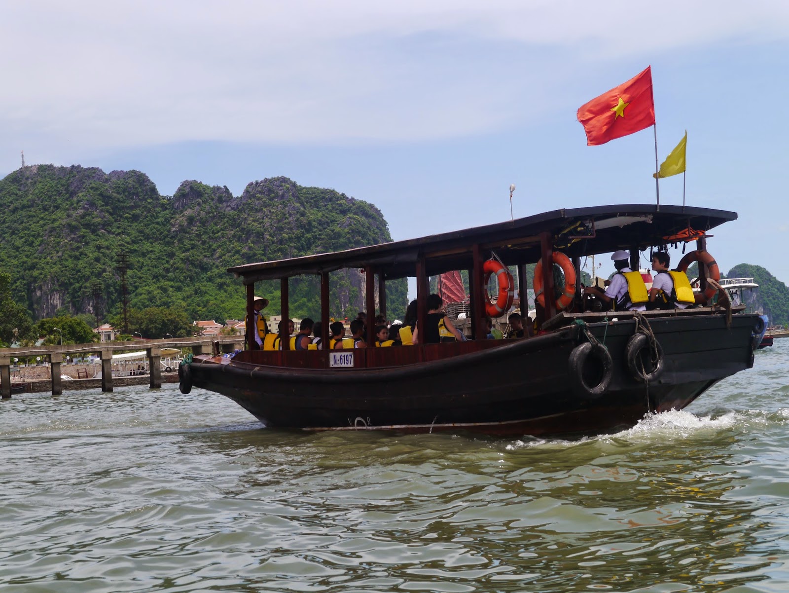 Pour moi, l’aventure  » Halong Bay  » a commencé dès que j’ai enfilé mon gilet de sauvetage jaune et ai pris place à bord du petit bateau à moteur devant m’emmener de l’embarcadère,  où de nombreux touristes attendaient également de partir en excursion,  à la jonque sur laquelle j’allais passer un peu plus de 36 heures.