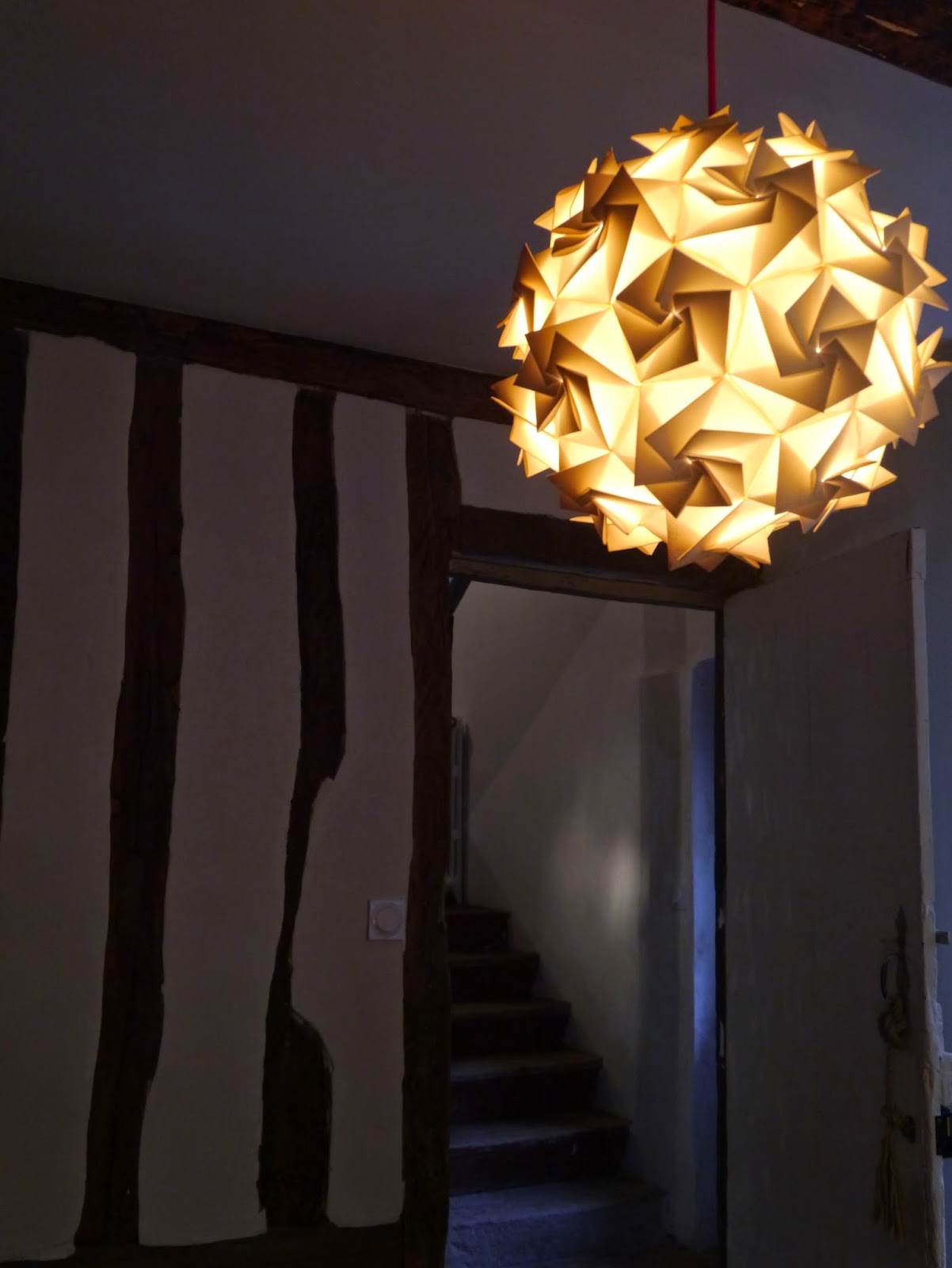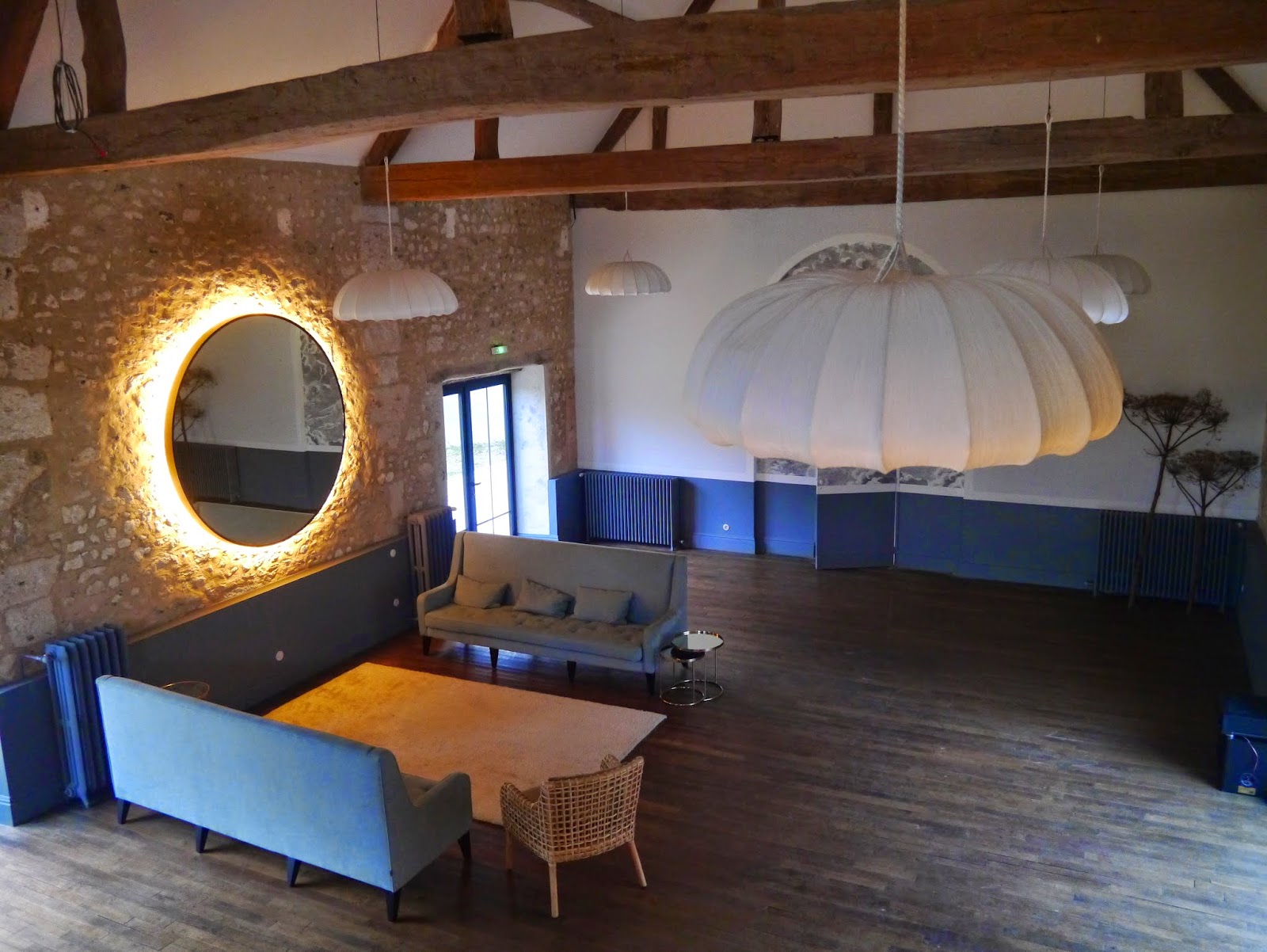Cette pièce principale m’a tout simplement époustouflée par sa phénoménale hauteur sous plafond, ses poutres, sa jolie cheminée, son salon cosy, ses miroirs et ses magnifiques lampes blanches pendants au plafond !