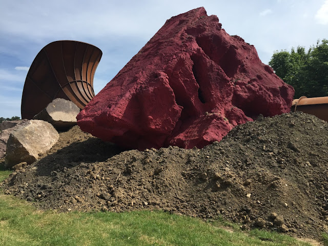 J’ai pour ma part été non seulement intriguée par cette imposante trompe, couleur rouille, qui semble vouloir aspirer tous ceux qui passent près d’elle, mais aussi étonnée de voir les énormes blocs de pierre ainsi que les fossés, de couleur rouge, creusés à ses côtés, sans oublier le long tube qui la termine.