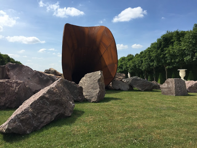 En découvrant, au cours d’un parcours résolument bucolique, 5 des 6 imposantes Å“uvres que le château accueille dans ses jardins depuis cinq jours.