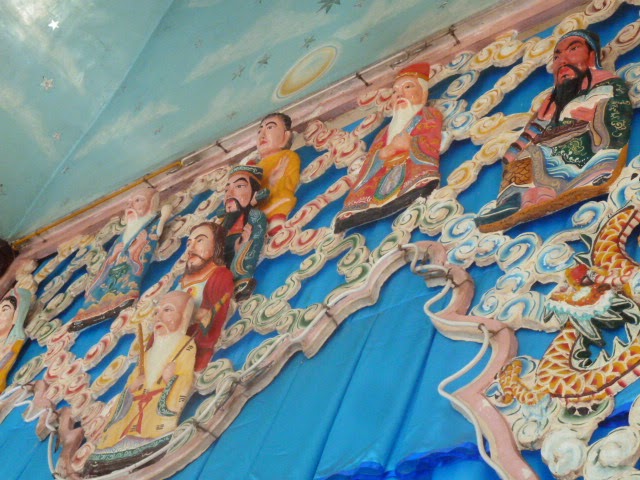 Encore plus surprenante a été pour moi l’observation, à l’entrée du temple, d’une fresque représentant les Trois Saints considérés par le caodaisme comme étant les guides spirituels de l’humanité : l’écrivain français Victor Hugo, l’homme d’état chinois Sun Yat Sen  tenant un encrier et le poète vietnamien Nguyen Binh Khiem.