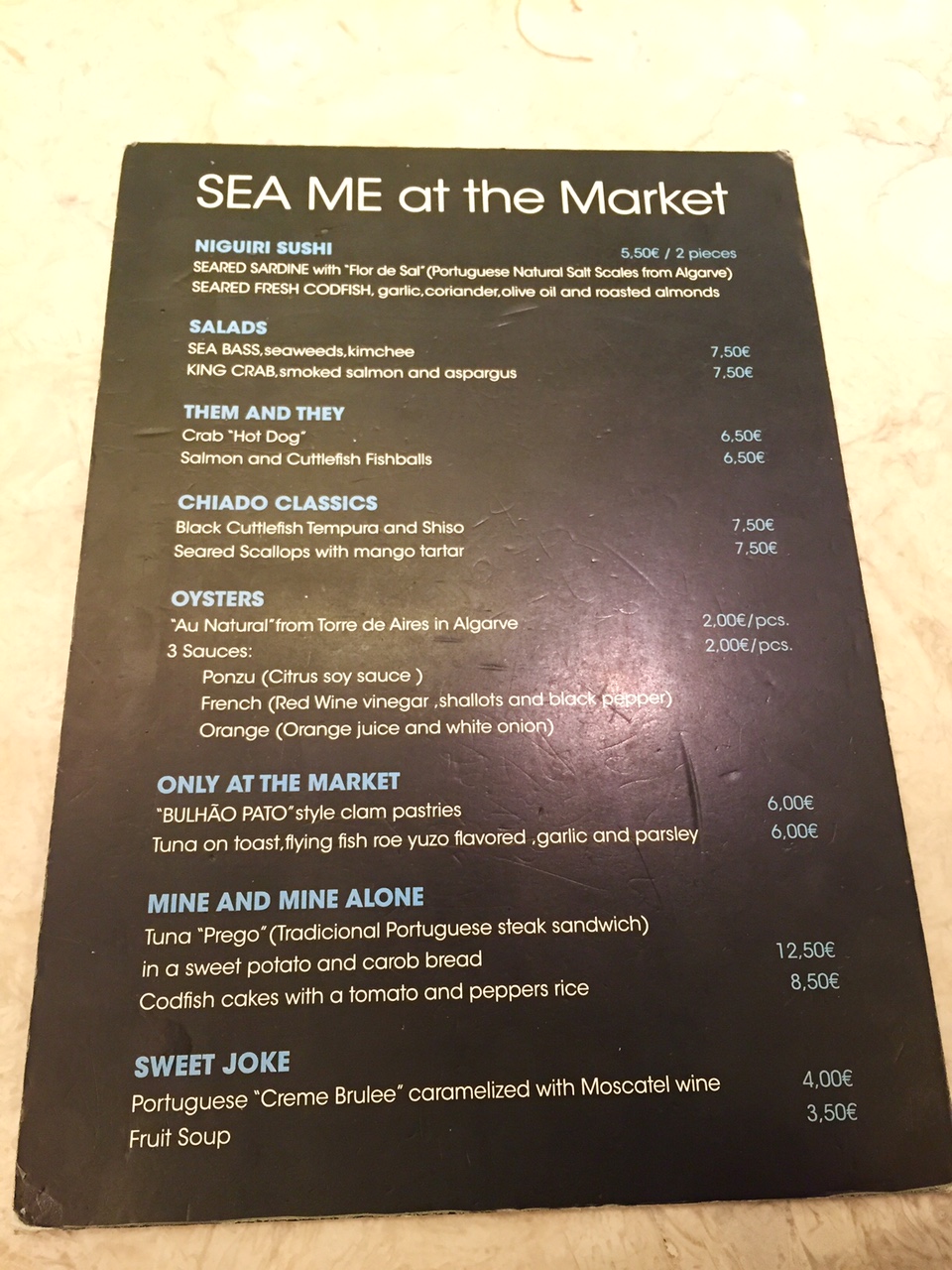 A défaut d’avoir pu dîner dans l’établissement-mère ou d’être allée découvrir Sea me by the River, le nouveau kiosque ouvert, depuis quelques mois, par le chef, le stand Sea Me du marché de la Ribeira était une aubaine que je ne pouvais pas manquer.