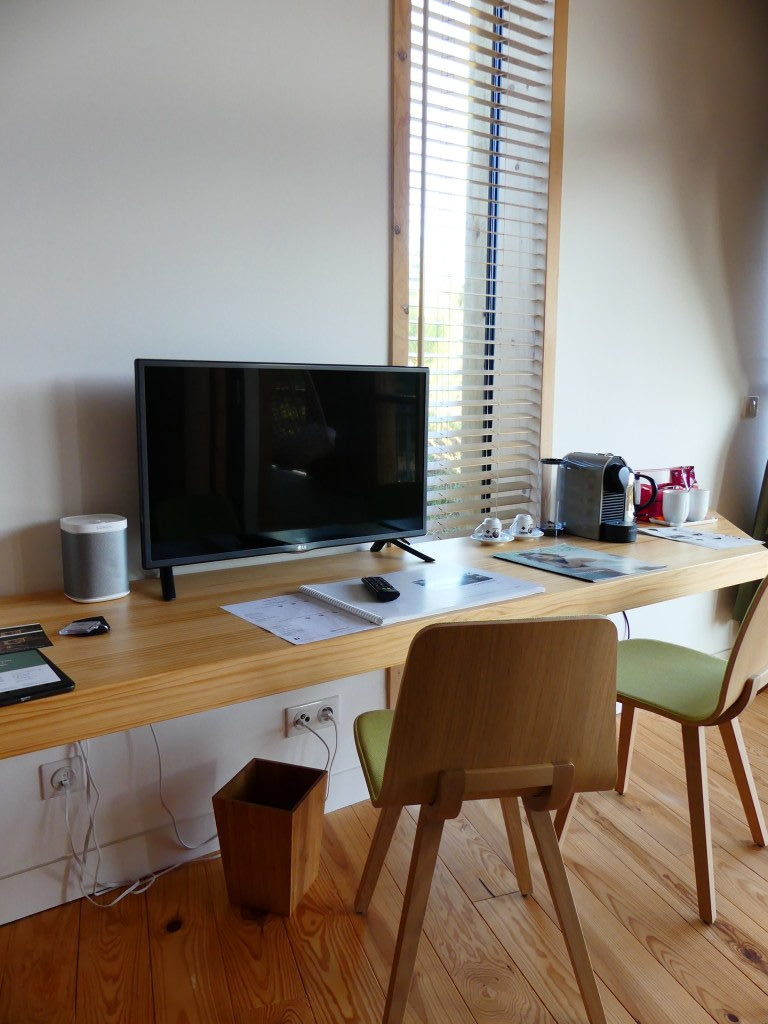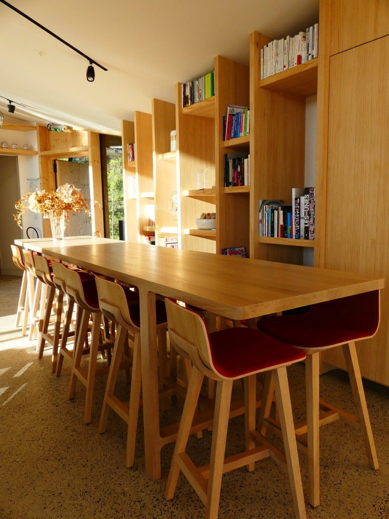 Ainsi, l’omniprésence du bois des Landes,  tant dans l’architecture que dans le mobilier conçu par le designer Jean-Louis Iratzoki,  saute immédiatement aux yeux.