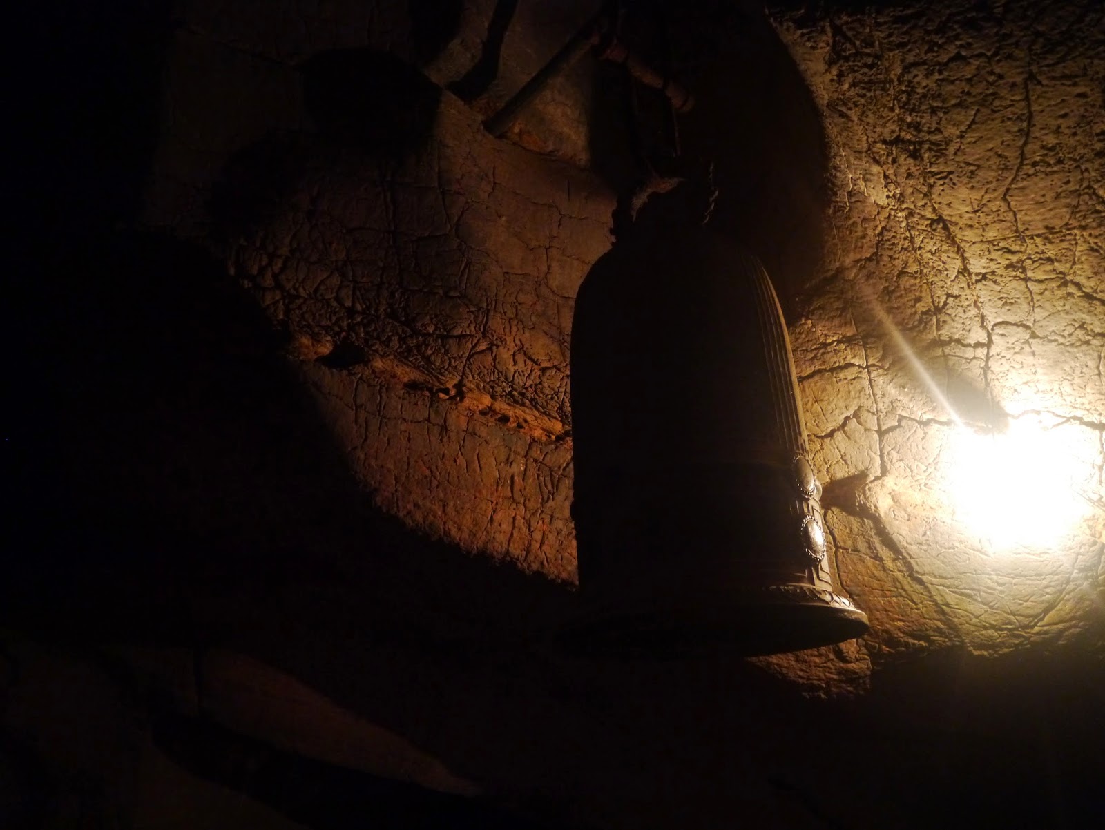 Pour atteindre la deuxième, nichée plus haut dans la roche, il m’a d’abord fallu longer plusieurs statues, un petit temple où trônaient encore des bâtons d’encens et enfin un gong.