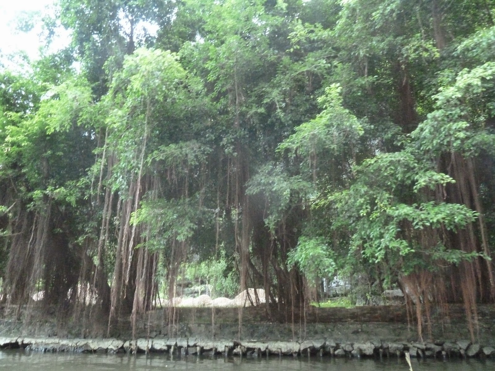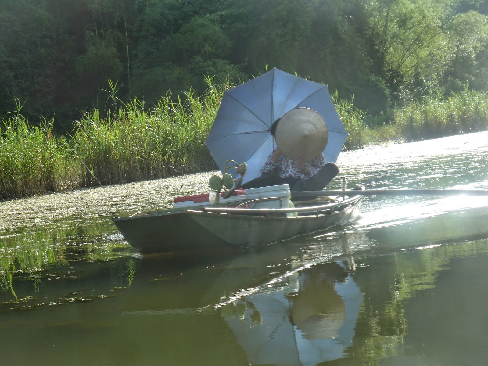 J’ai ainsi pu apercevoir de nombreux villageois, hommes et femmes, ramant à bord de leur sampan, seul moyen de locomotion possible, pour aller vendre leur production sur la terre ferme.