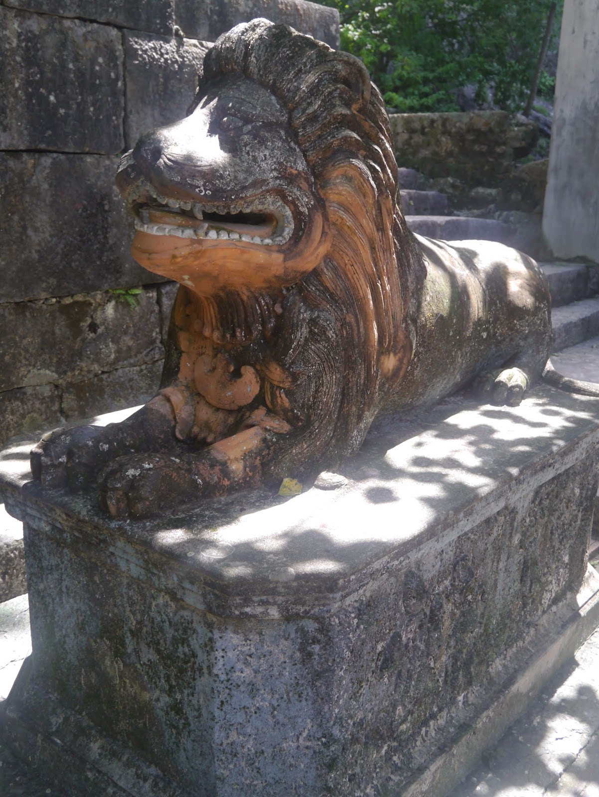 Piliers travaillés, couleur or et rouge, représentations de dragons, statue du souverain, sabres : j’ai retrouvé tous les éléments relatifs à l’architecture « sacrée » dont je vous parlais déjà dans mon article introductif sur le Vietnam.