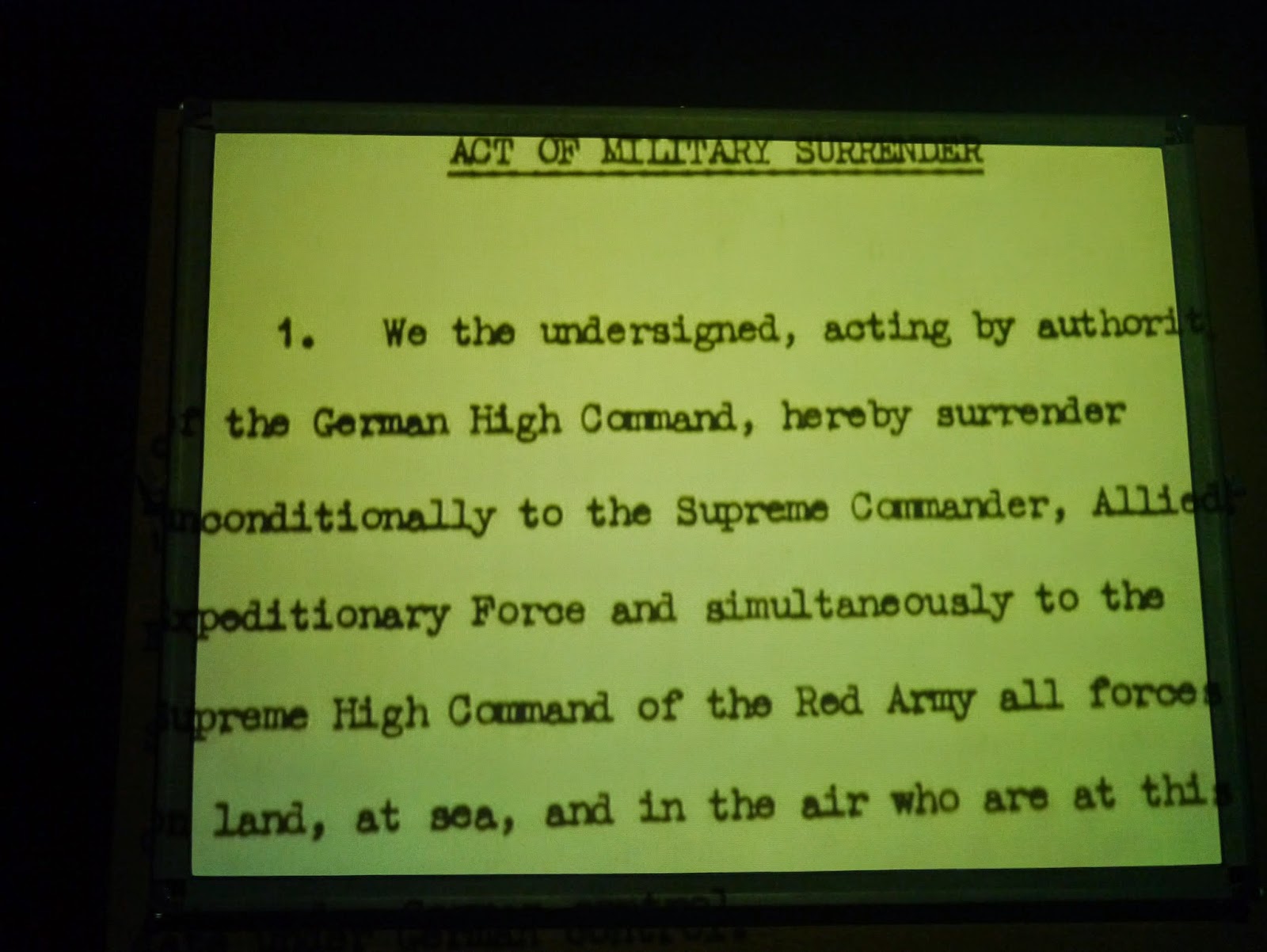 En effet la reddition allemande, sans conditions, fut signée la veille, soit le 7 mai à 2h 41 du matin, par le général Jodl, chef d’état major allemand mandaté par l’amiral Donitz (ayant succédé à Hitler), dans la salle des cartes de l’actuel collège technique Franklin Roosevelt de Reims.