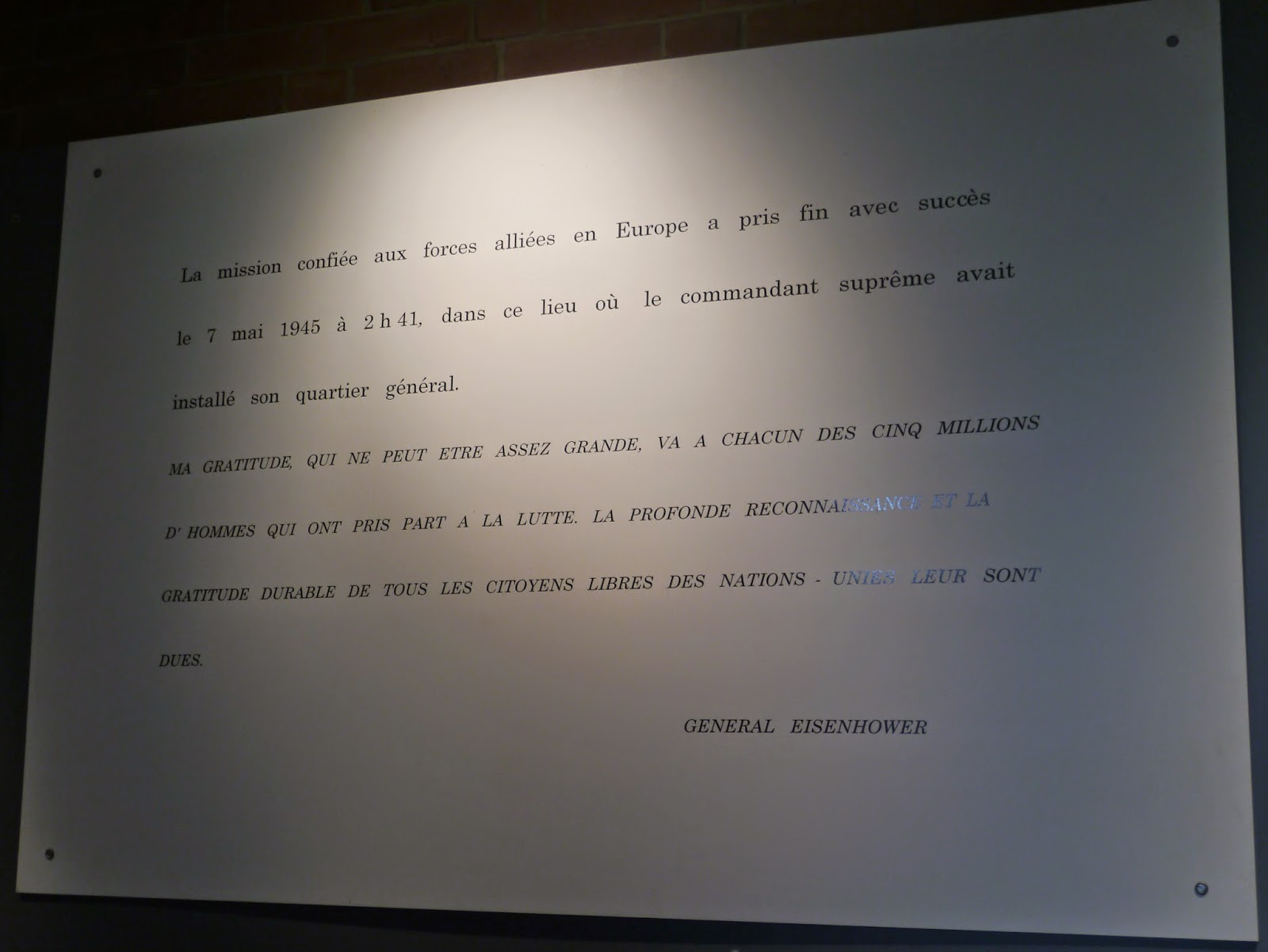 C’est dans le quartier général où  le Général américain Eisenhower a installé, quelques mois plus tôt, son QG que l’acte de reddition de l’Allemagne nazie sera signé le 7 mai 1945.