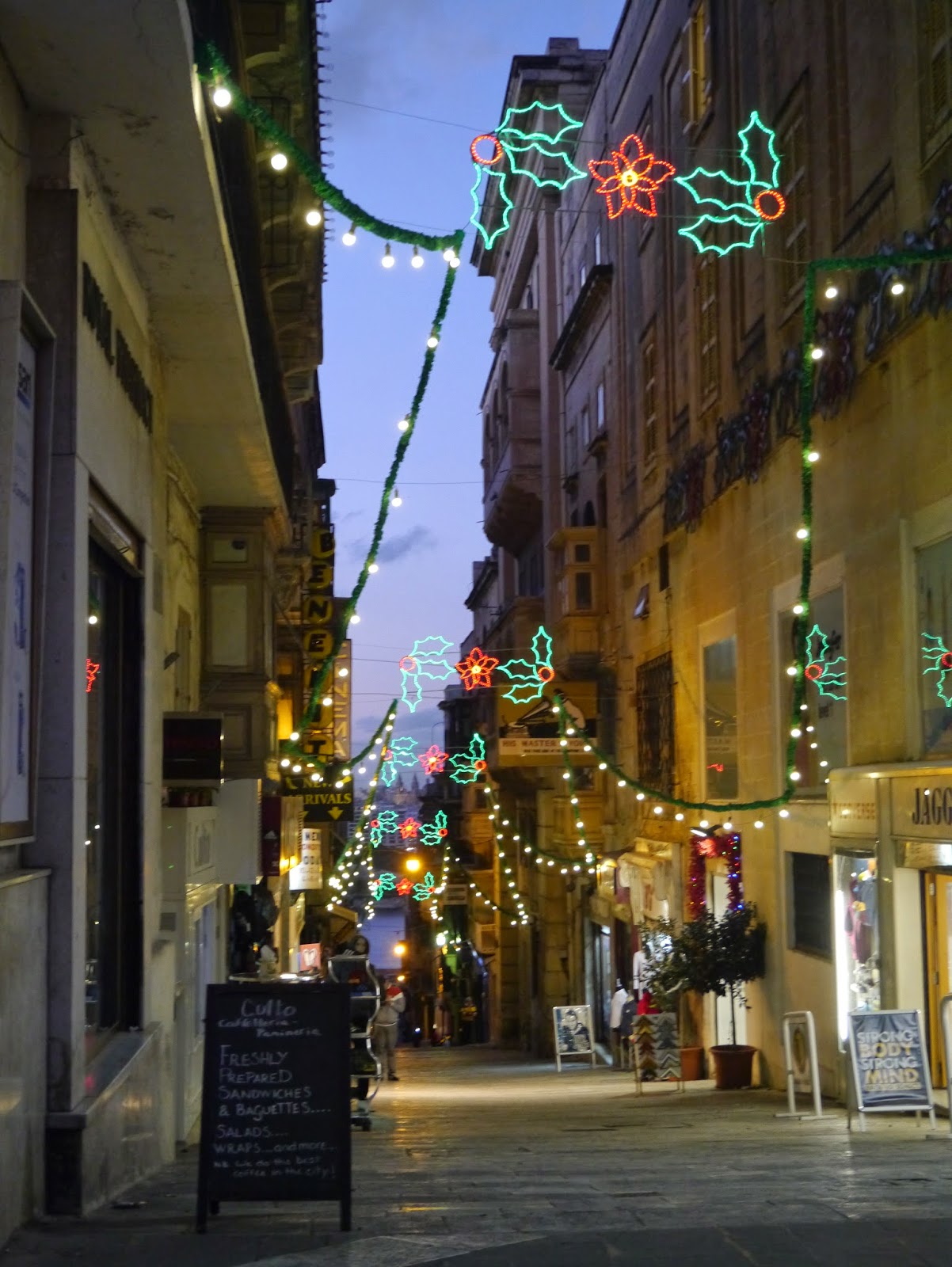 Magie des ruelles, de nuit, une fois que La Valette se pare des décorations de noël et que les maltais prennent d’assaut cafés et restaurants ou encore plusieurs églises dont celles de Saint Paul le naufragé, Notre Dame de la Victoire ou des Carmélites dont le magnifique dôme domine la cité.