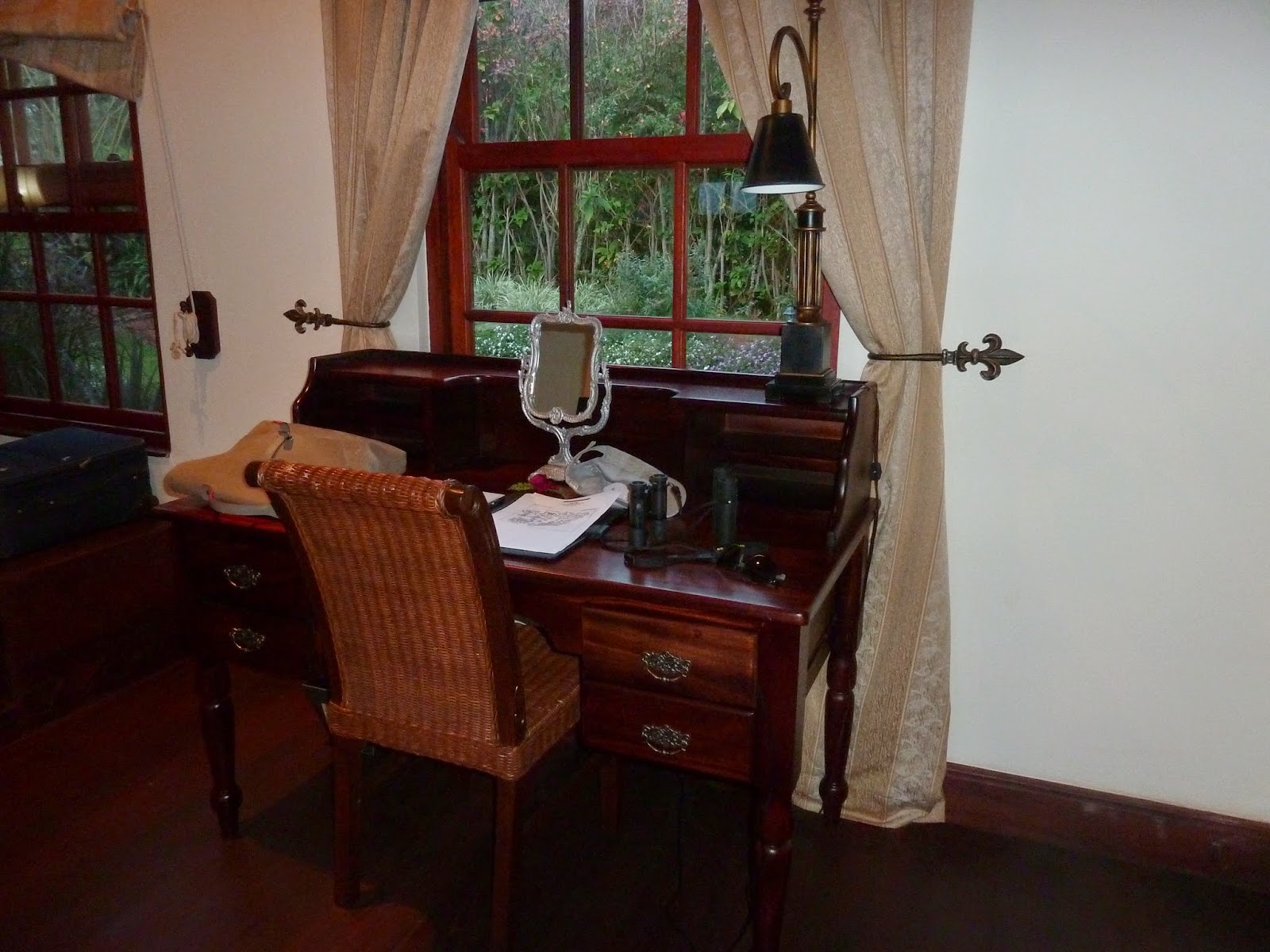 Quelle ne fut donc pas notre surprise de découvrir, après avoir traversé le jardin accompagné par un employé de l’hôtel, une magnifique suite, avec cheminée, une salle de bain immense et une terrasse donnant sur les plantations de café.