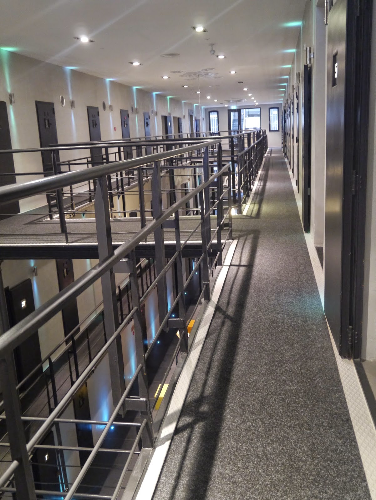 Sur les cotés, à chacun des 3 étages de l’établissement, se répartissent la quarantaine de chambres, anciennes cellules, bureaux administratifs ou quartiers du directeur aujourd’hui tous reconvertis,  que compte l’hôtel.
