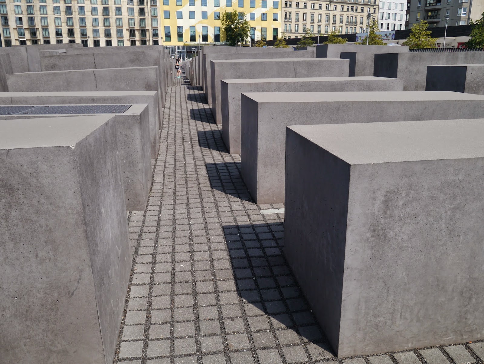 Un étroit labyrinthe,  composé de plus de 2000 stèles de différentes hauteurs naissant du sol, rend hommage à toutes les victimes européennes du génocide juif.