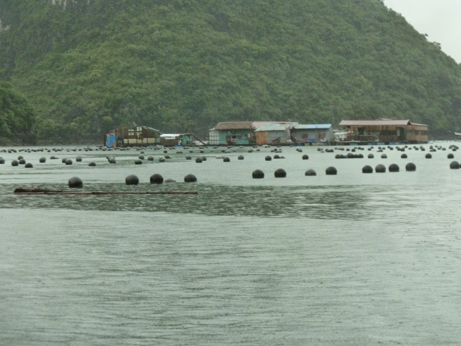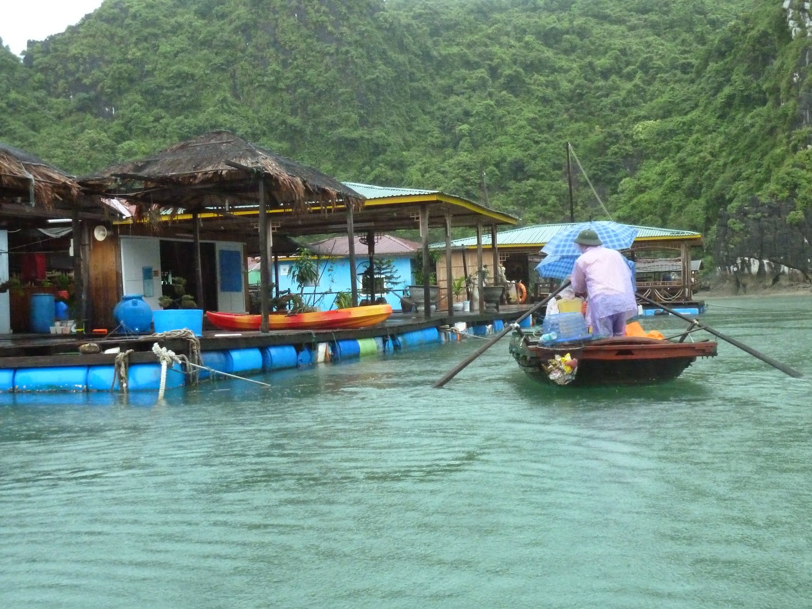 De la Baie d’Along j’ai aussi découvert, le lendemain matin, juste avant d’achever ma croisière et de m’envoler pour Hué, un village flottant de pêcheurs, ayant la particularité d’être bâti sur des flotteurs construit à l’aide de gros bidons vides.