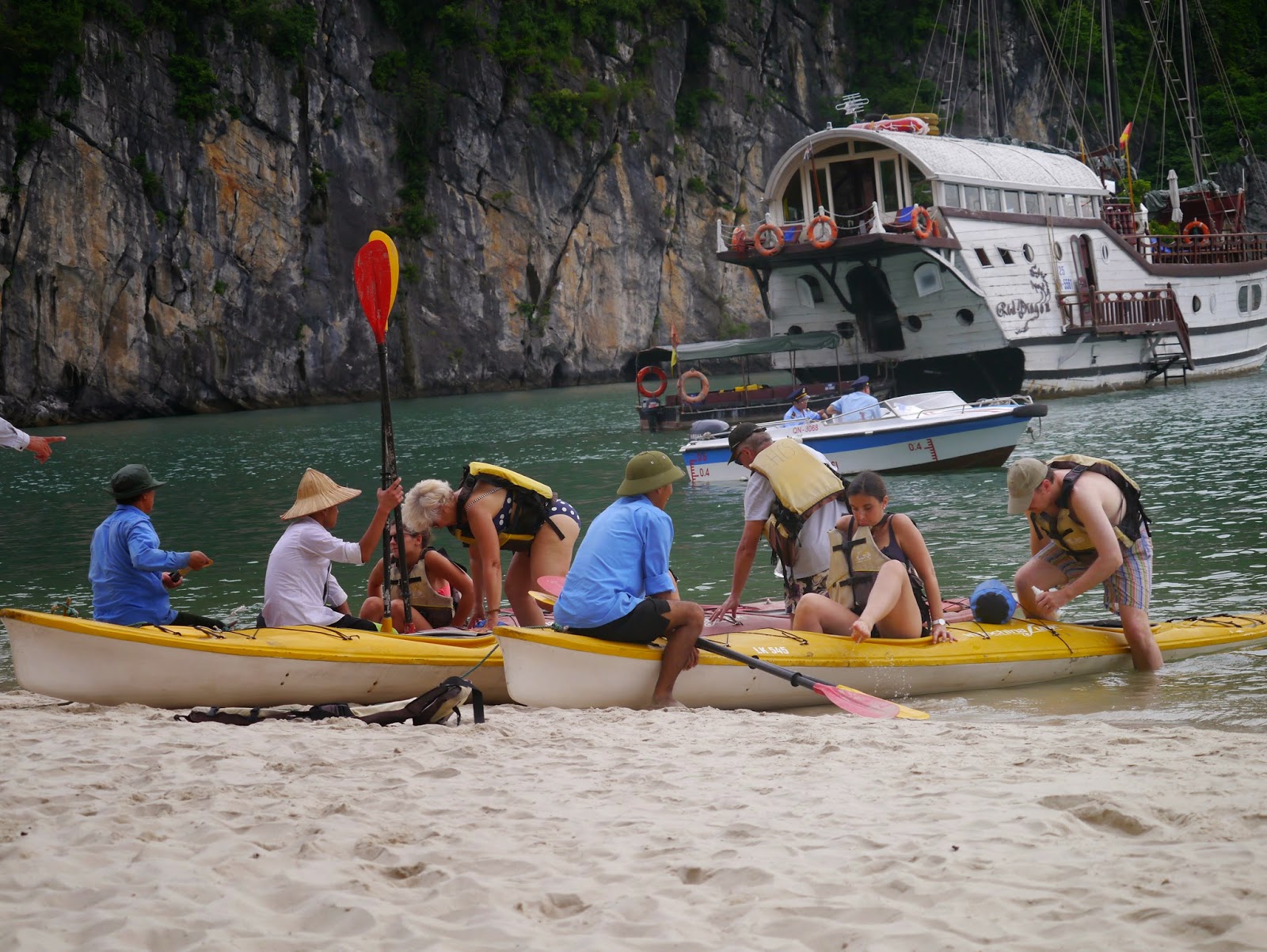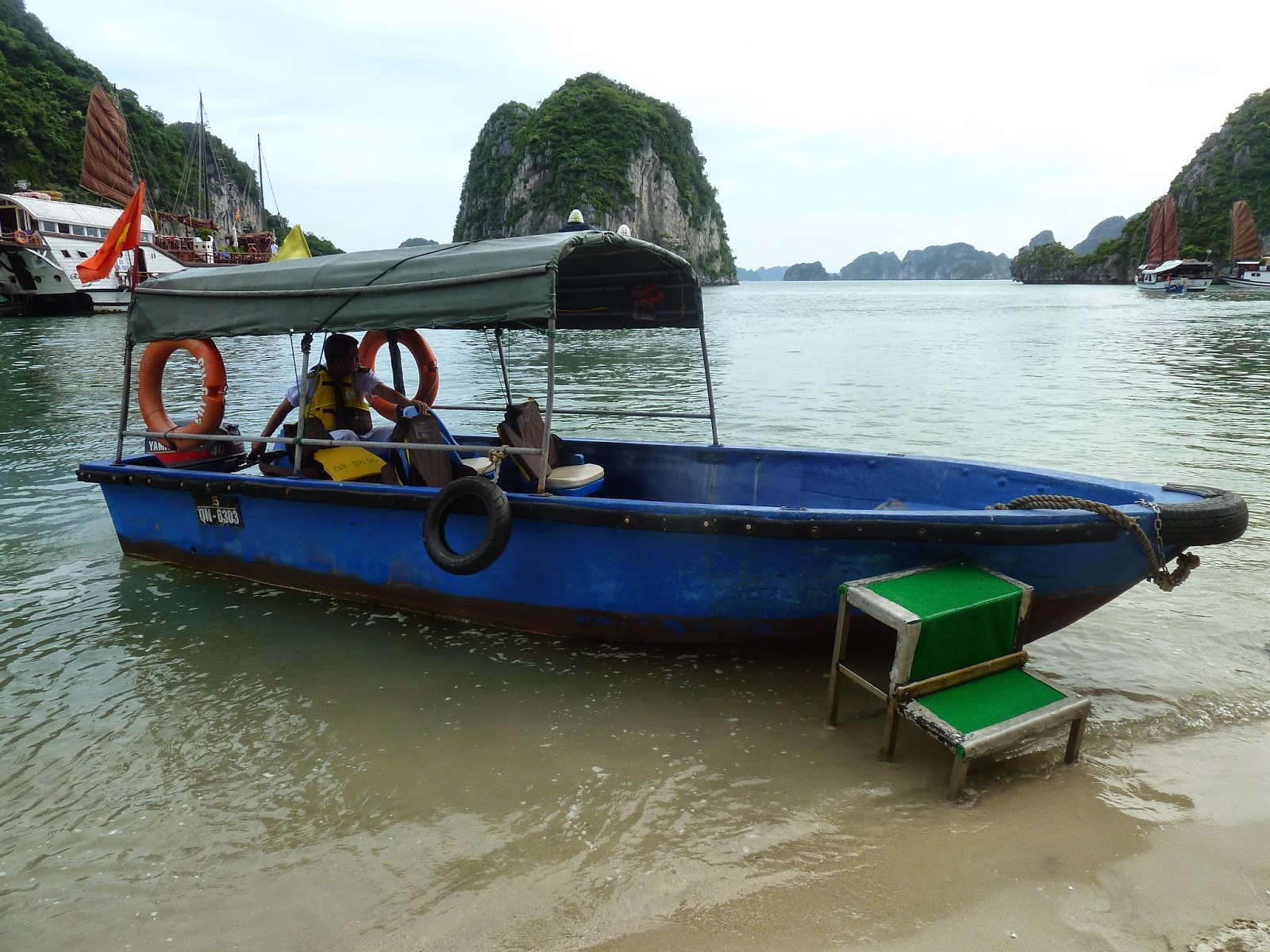 Pour moi, l’aventure  » Halong Bay  » a commencé dès que j’ai enfilé mon gilet de sauvetage jaune et ai pris place à bord du petit bateau à moteur devant m’emmener de l’embarcadère,  où de nombreux touristes attendaient également de partir en excursion,  à la jonque sur laquelle j’allais passer un peu plus de 36 heures.
