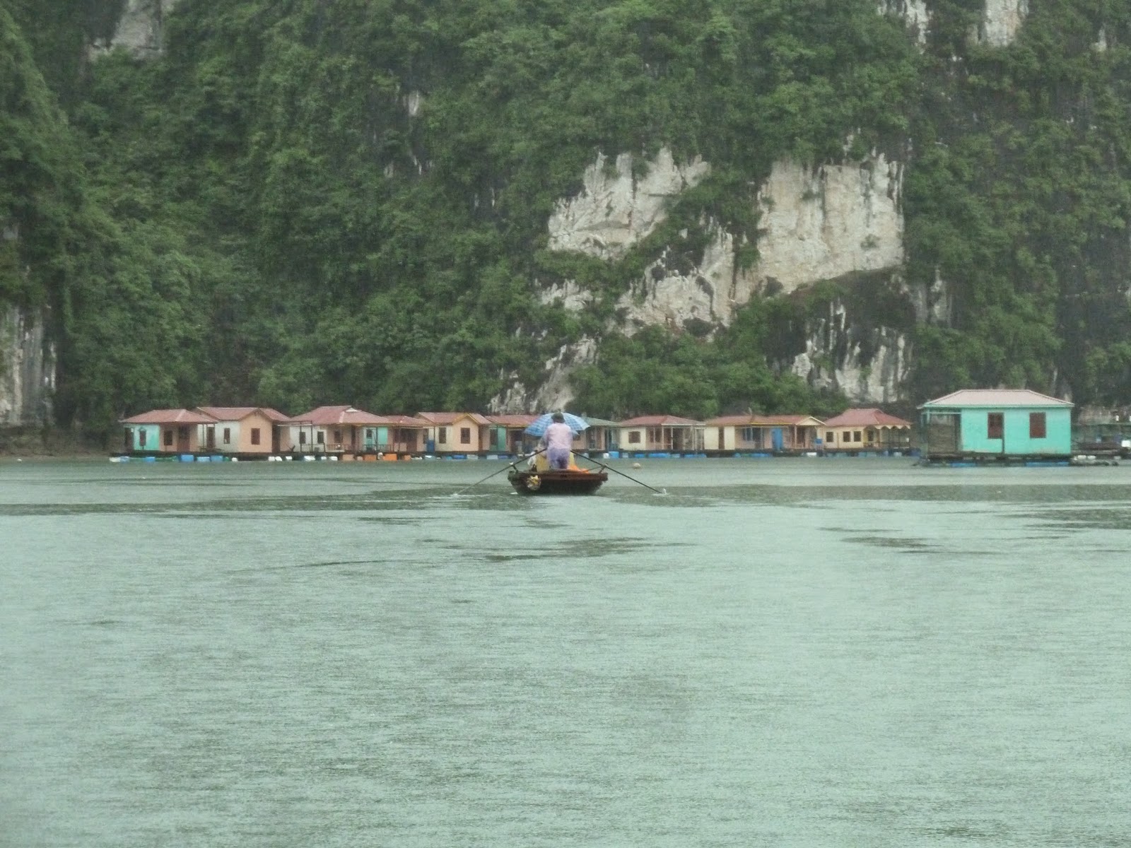 De la Baie d’Along j’ai aussi découvert, le lendemain matin, juste avant d’achever ma croisière et de m’envoler pour Hué, un village  flottant de pêcheurs, ayant la particularité d’être bâti sur des flotteurs construit à l’aide de gros bidons vides.