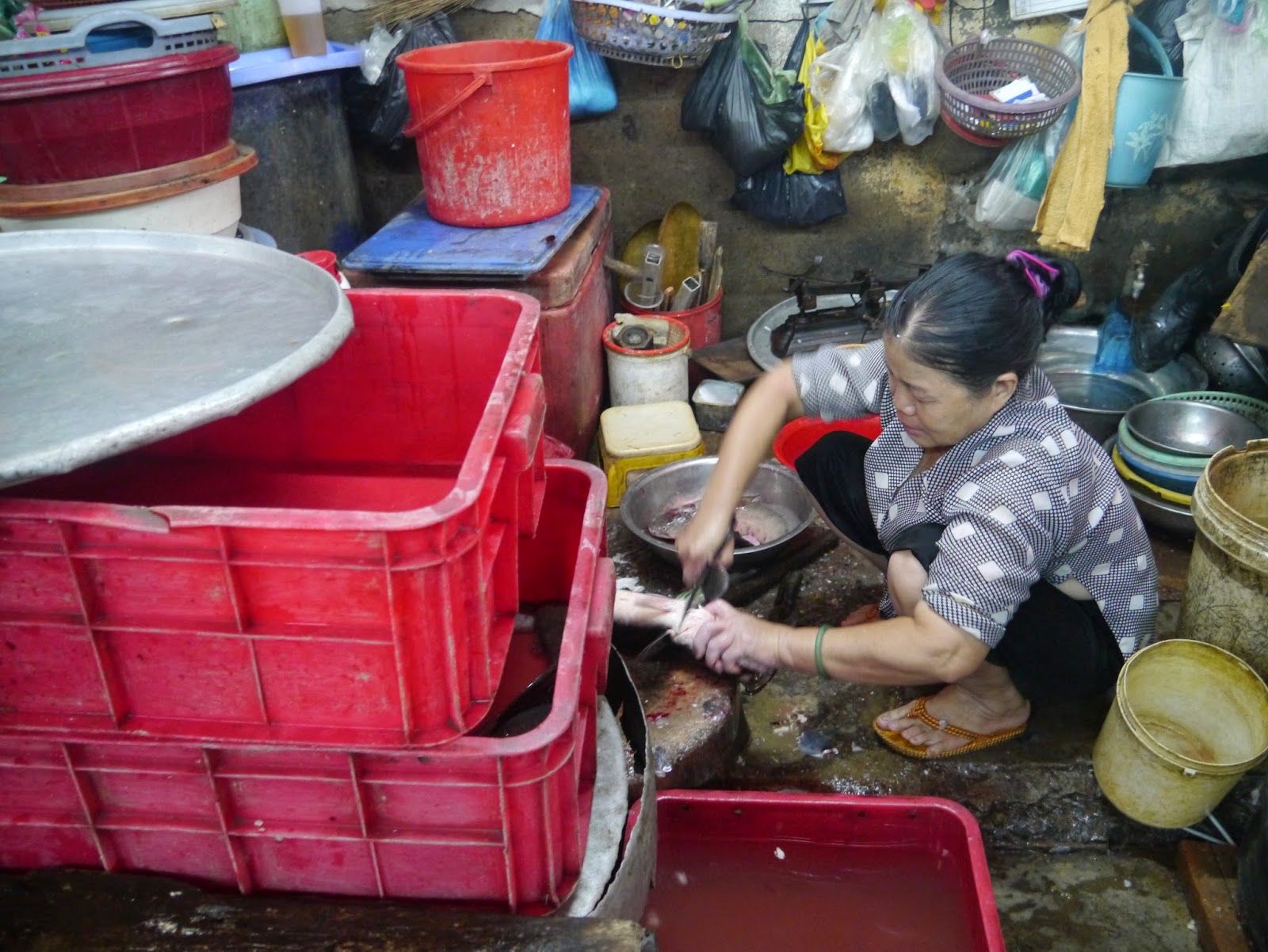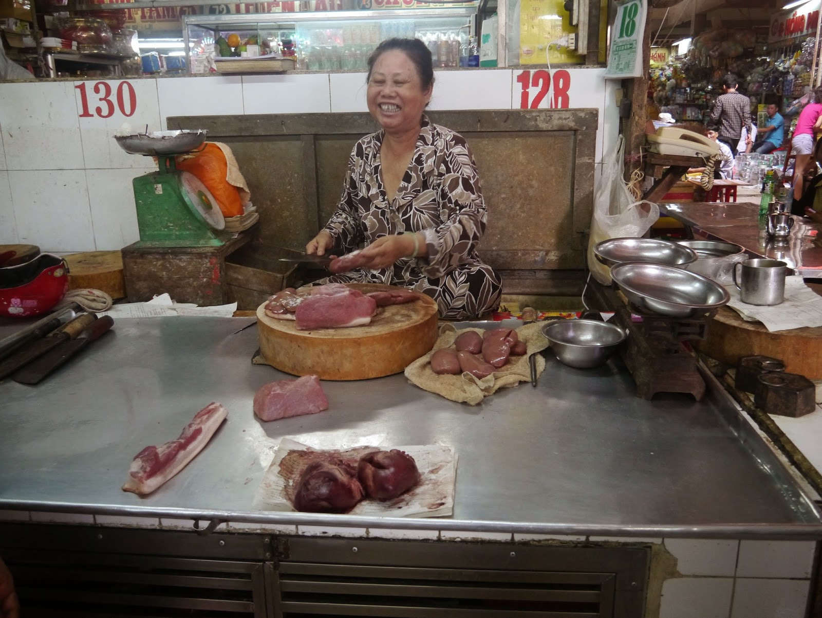Mais avant de quitter ce marché, la dernière image qui m’a hypnotisée a été celle des femmes bouchers qui hélaient encore le chaland, dans la joie et la bonne humeur, afin d’écouler les morceaux de bÅ“uf, canard ou  porc qui leur restaient.