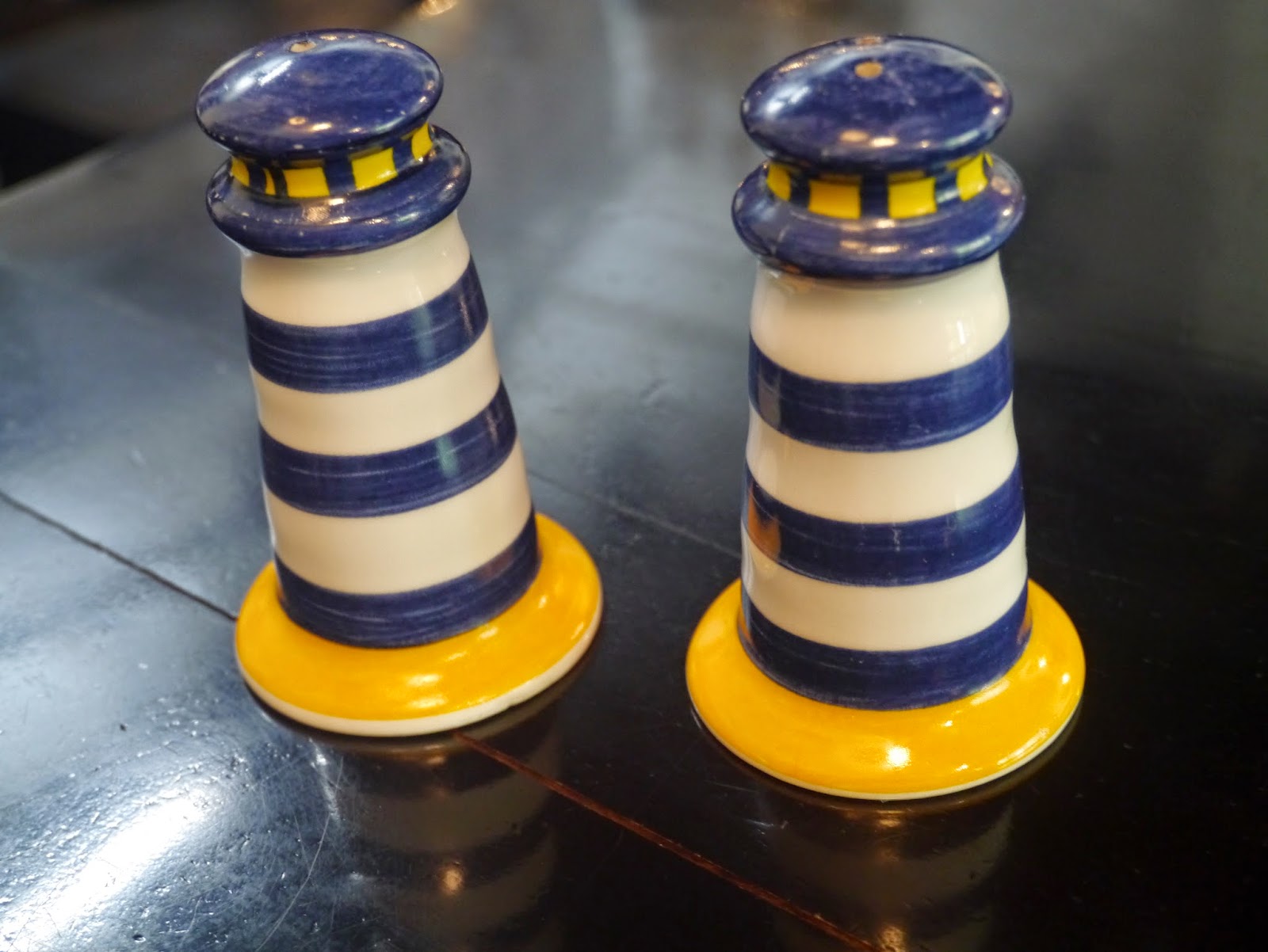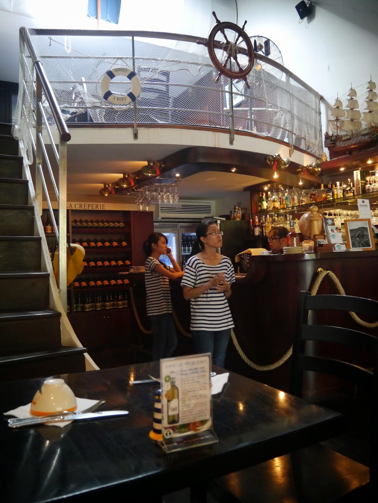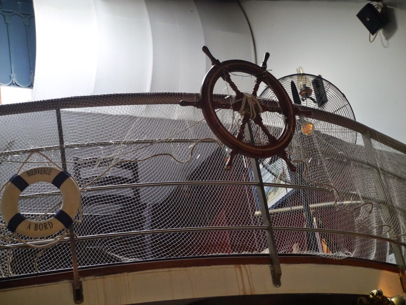 Un phare en guise de façade, une coque renversée de bateau à l’intérieur du restaurant, des banquettes, de couleur bleue et blanche, rayées,  des photos évoquant la mer accrochées un peu partout et des serveuses vêtues de marinières !