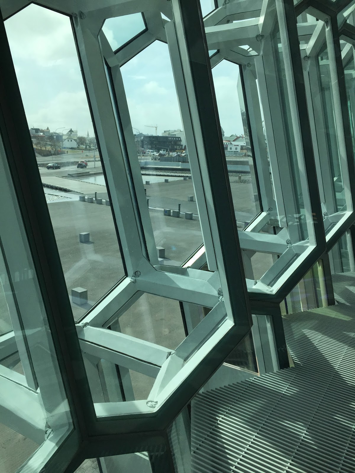 L’Harpa m’a par ailleurs rappelée, par sa structure, ses fenêtres en nid d’abeille et la vue offerte sur l’eau, le Mucem Marseillais dont je vous ai également parlé  .