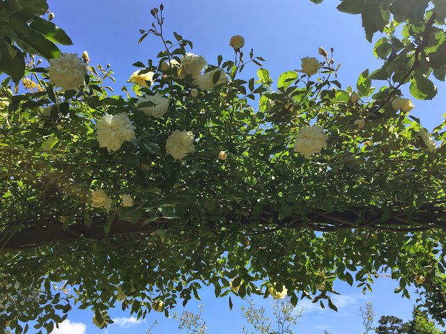 Roses rose mais aussi blanches, lesquelles s’enroulaient déjà autour des tonnelles.
