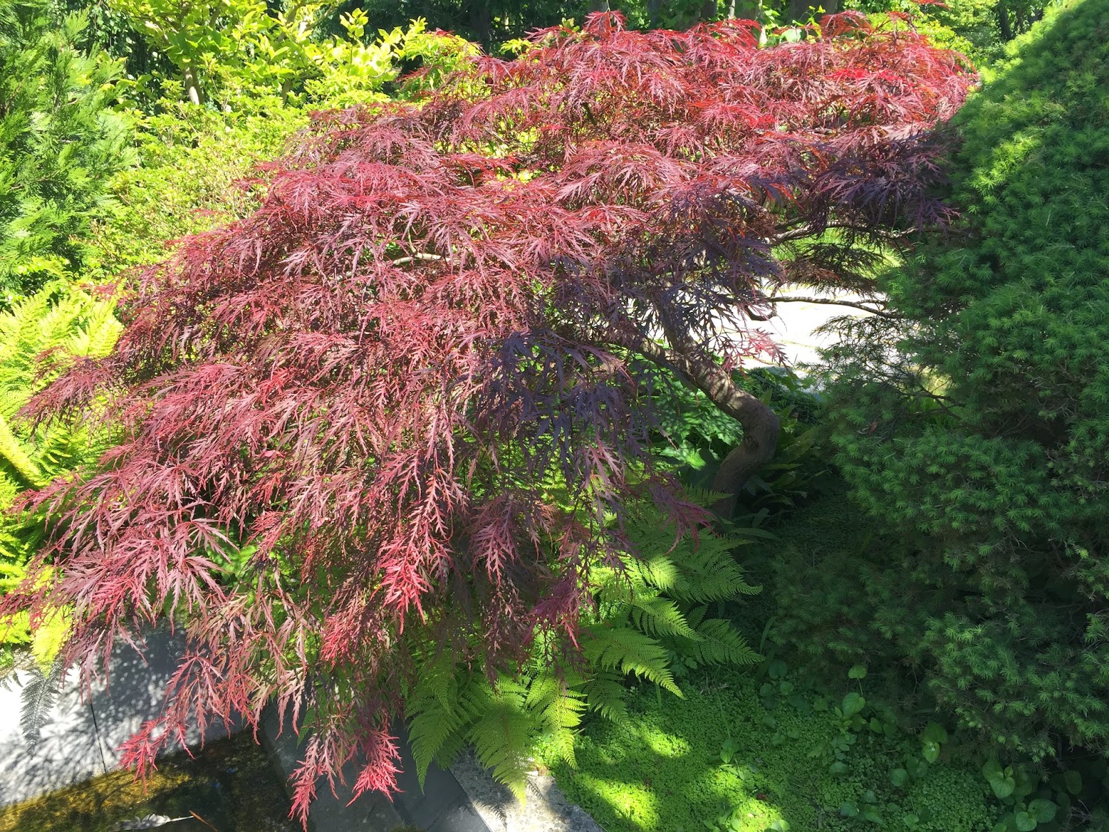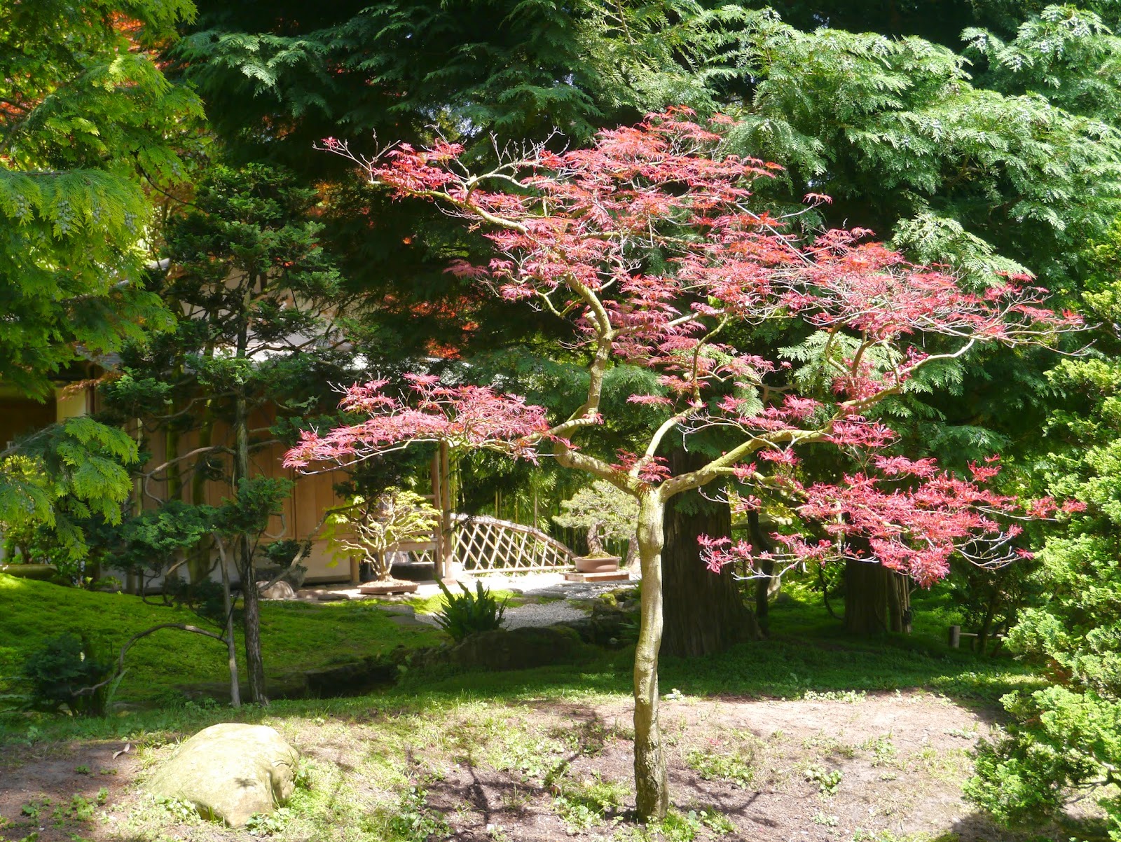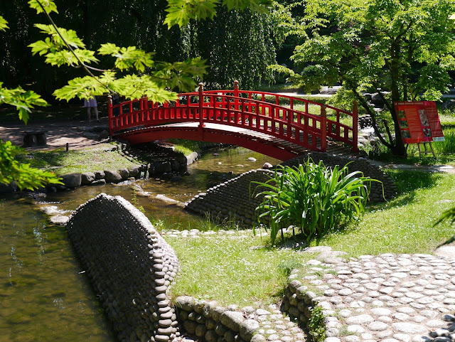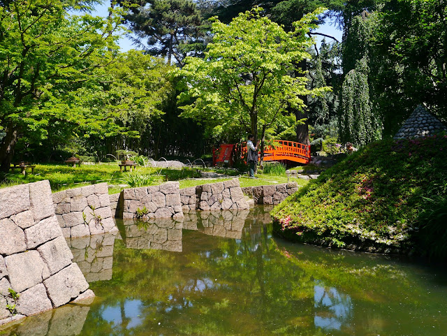 Forets de bambous, cerisiers, bonsaïs en pots, bassins aux nénuphars où nagent en toute quiétude des poissons japonais orange côtoient deux ponts dont le magnifique pont rouge où presque tous les visiteurs se pressent pour prendre une photo souvenir.