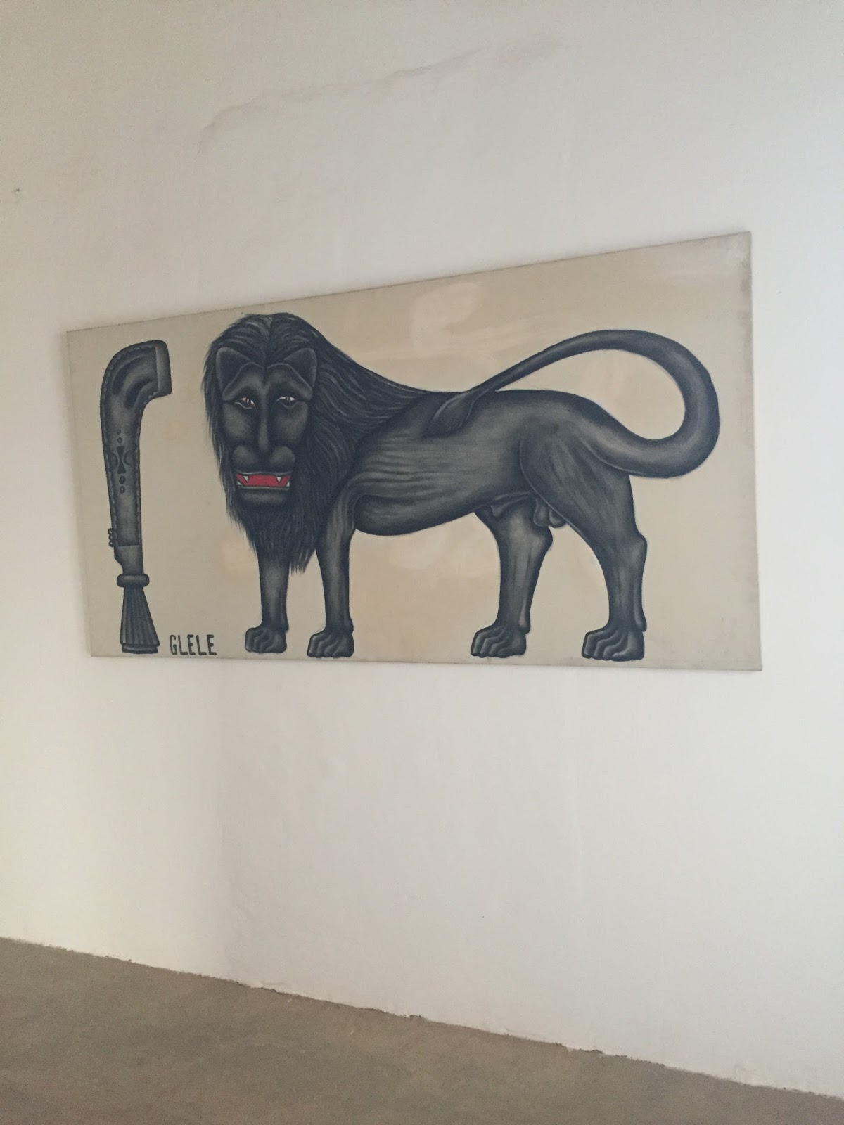 Ainsi, la première salle que j’ai visitée (jouxtant la librairie) était consacrée au tableaux de feu Cyprien Tokoudagba (qui exposa, en 1989, au centre Pompidou lors de l’exposition les Magiciens de la terre) mettant notamment en scène les emblèmes des rois du Dahomey.