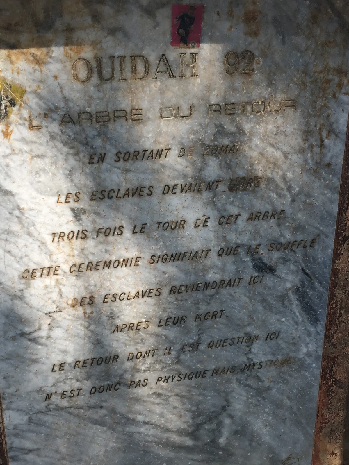 Elle marque, en effet, l’emplacement de l’arbre de l’oubli autour duquel les esclaves devaient tourner (7 fois pour les femmes et 9 fois pour les hommes) afin de tout oublier  (leurs identités, repères et patrie) et ne plus être enclins à une éventuelle rébellion.