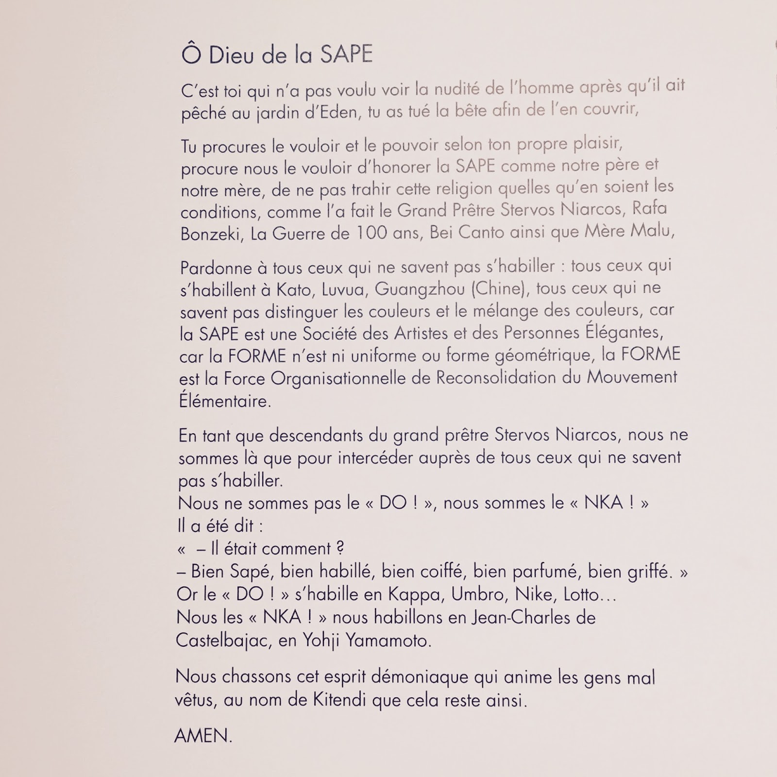 J’avais d’ailleurs, en février dernier, adoré découvrir, dans le cadre de l’exposition Le Bord des Mondes alors présentée au Palais de Tokyo, la prière des Sapeurs.