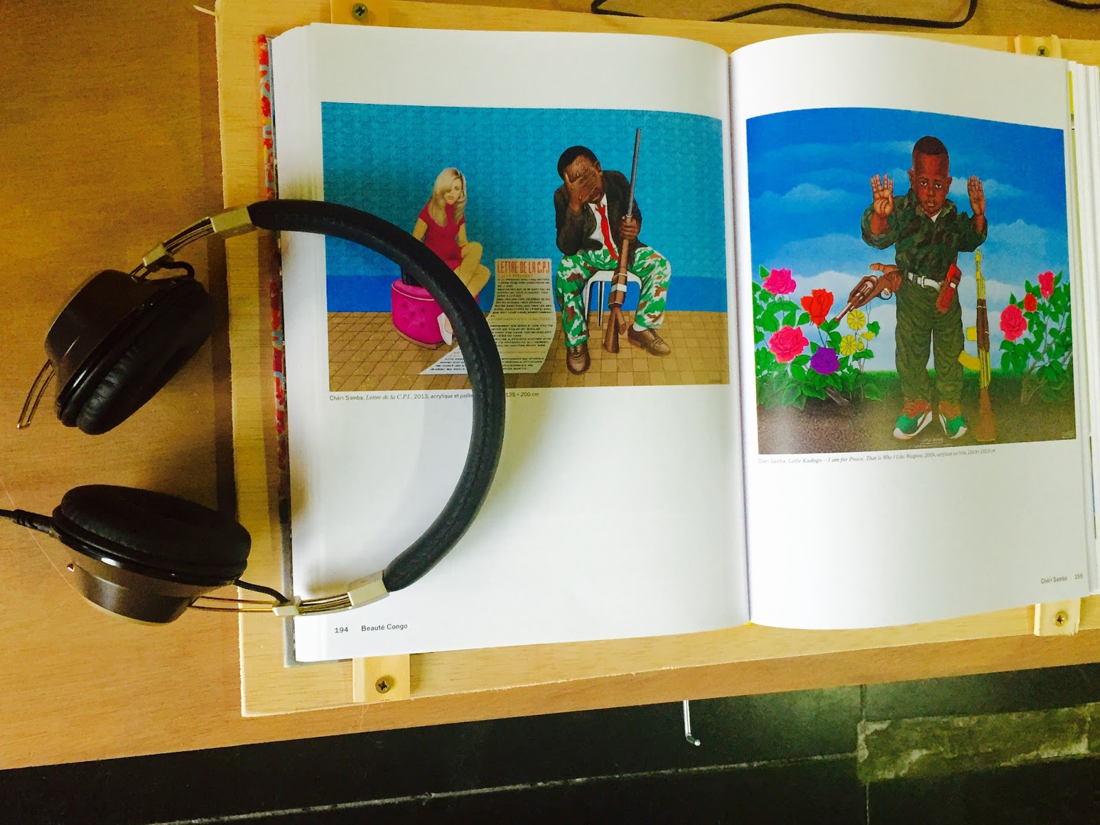Puis  asseyez vous face au mur de pagnes  pour feuilleter les ouvrages consacrés à l’exposition parisienne Beauté Congo,  au sculpteur béninois Kifouli Dossou ou encore Folk Art Africain.