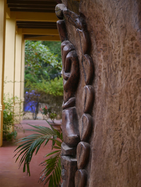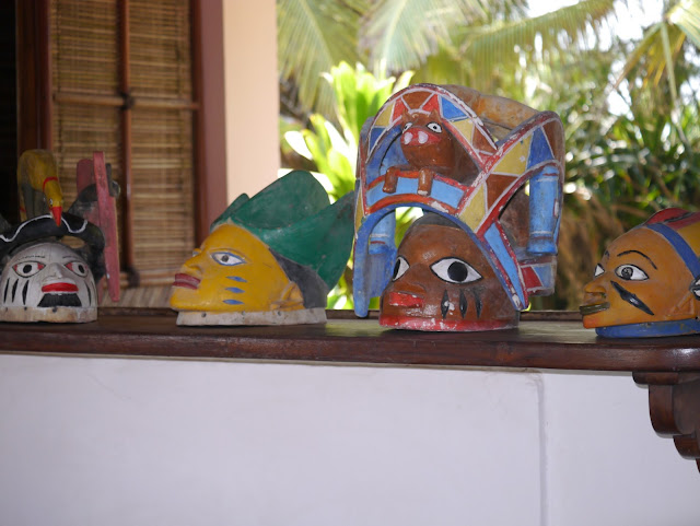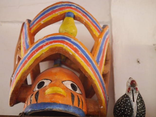Ainsi, en pénétrant dans cette première pièce (servant tout autant de lobby, de bibliothèque ainsi que de petit coin où prendre l’apéritif)  je n’ai eu d’yeux que pour les superbes masques hauts en couleurs  (lesquels font d’ailleurs penser à ceux de l’artiste béninois Kifouli Dossou déjà évoqués ici et là ), posés en rebord de fenêtres, qui la décorent.