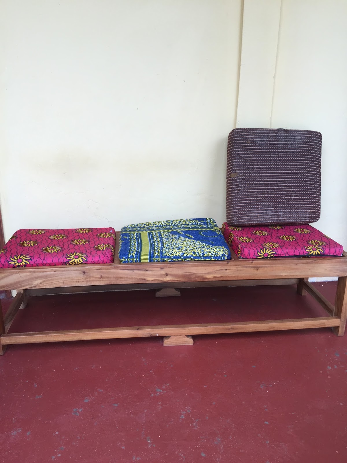 les assises, cousues en wax, des nombreux bancs installés à l’arrière du bâtiment principal