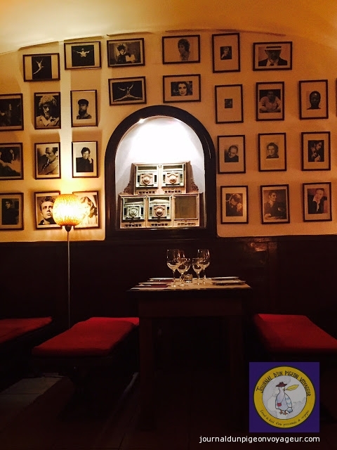 Une fois le seuil de la porte franchi, c’est un univers cosy et romantique à souhait, avec couleur rouge (ma préférée), lumière tamisée ainsi que portraits (essentiellement d’acteurs) en noir et blanc, accrochés aux murs, qui  vous attend.