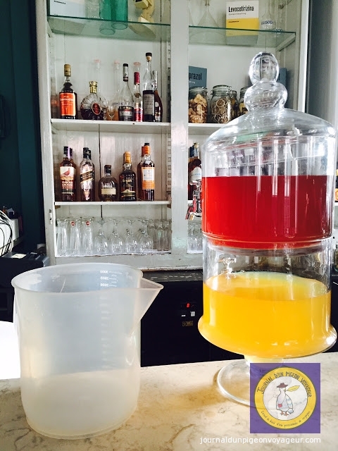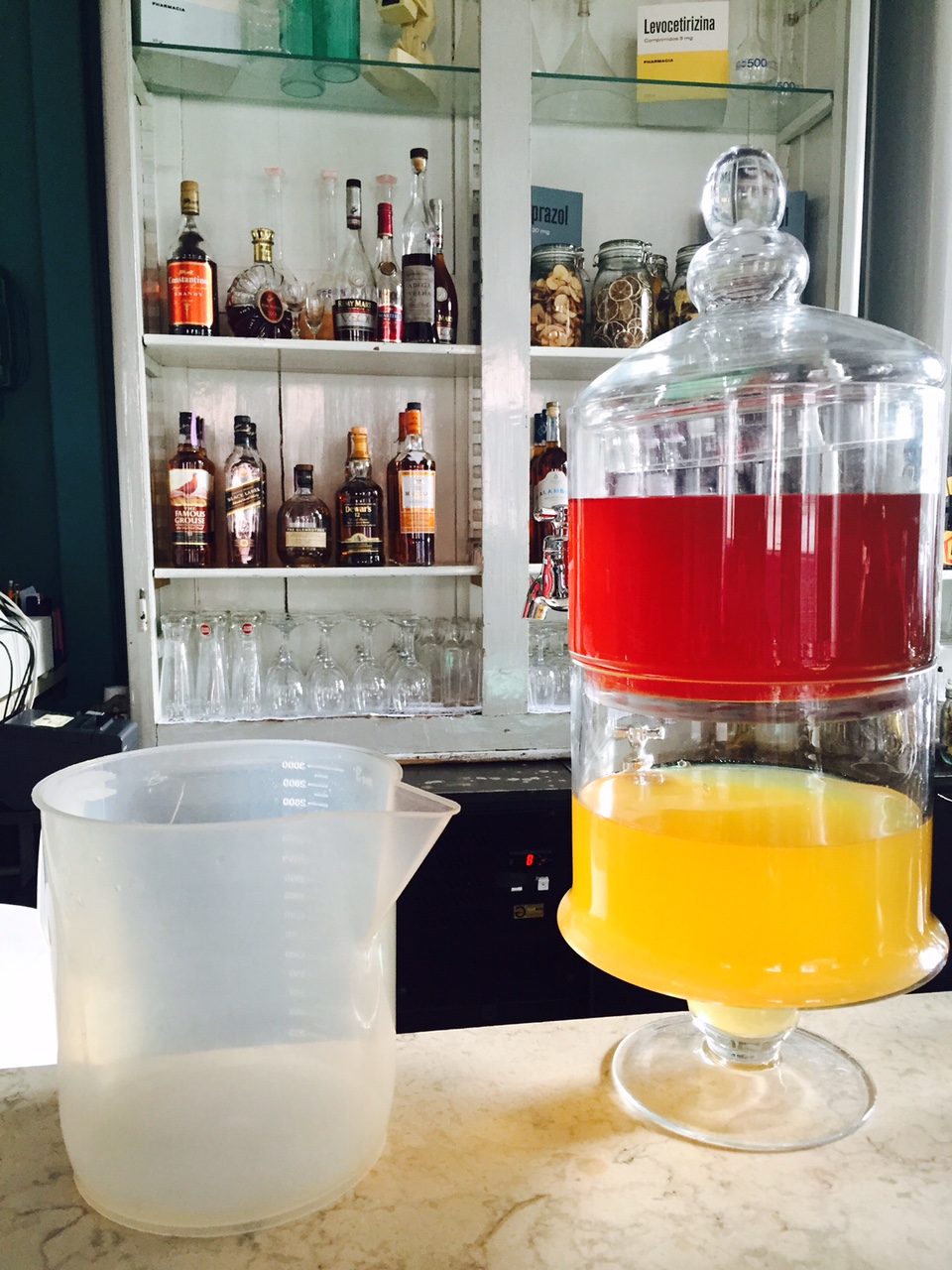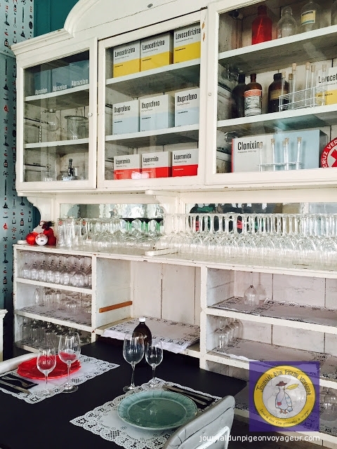 Mais l’attrait, instantanément perceptible, de cet insolite établissement réside dans sa salle intérieure dont la décoration renvoie à l’aménagement des pharmacies d’antan et, se faisant,  à l’univers médical.