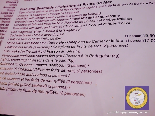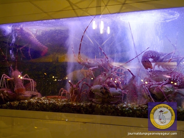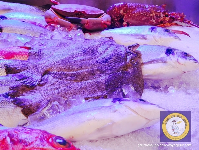 La carte propose, en effet, de nombreux plats préparés à partir de crustacés et poissons (de première fraîcheur) choisis, sur un étal ou dans l’aquarium, visibles au premier niveau du restaurant.