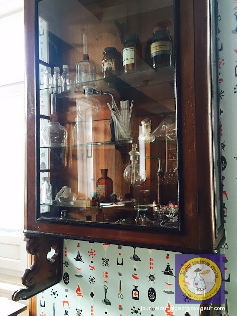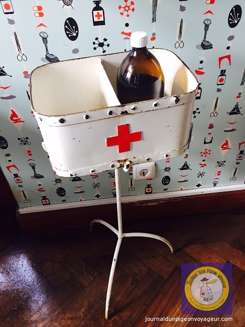 Ainsi, ne soyez pas surpris d’y retrouver un pèse personne, des armoires à pharmacie où figurent, pèle mêle,  boites de médicaments, tubes, éprouvettes et flacons en tout genre, des livres de médecine et des photographies, en noir et blanc, d’une ancienne pharmacie.