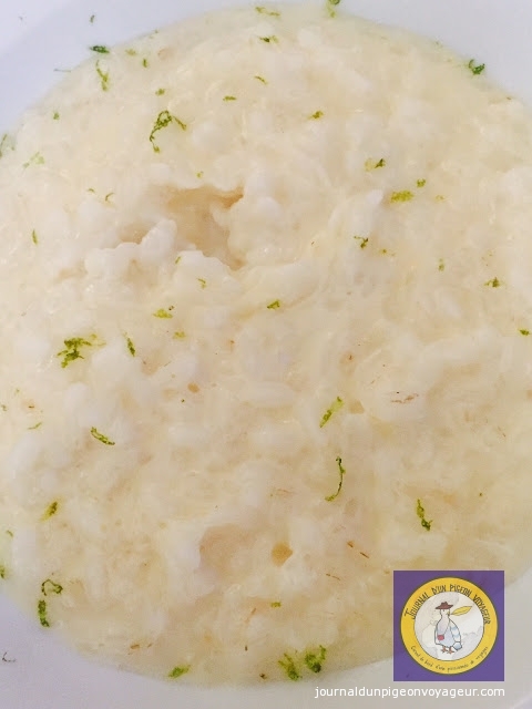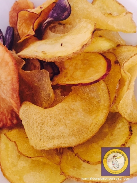 risotto au citron vert sans oublier l’assortiment de fines chips (maison) de pomme de terre classique, de vitelotte et d’igname ! Â