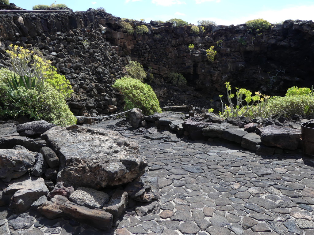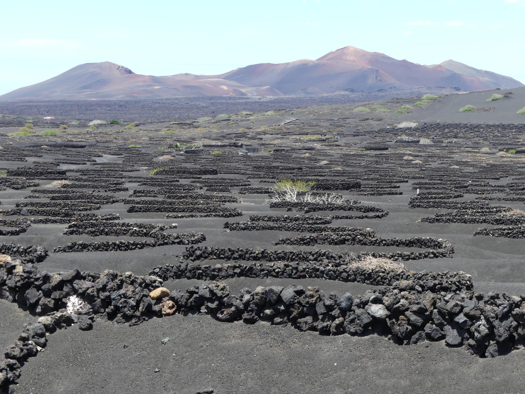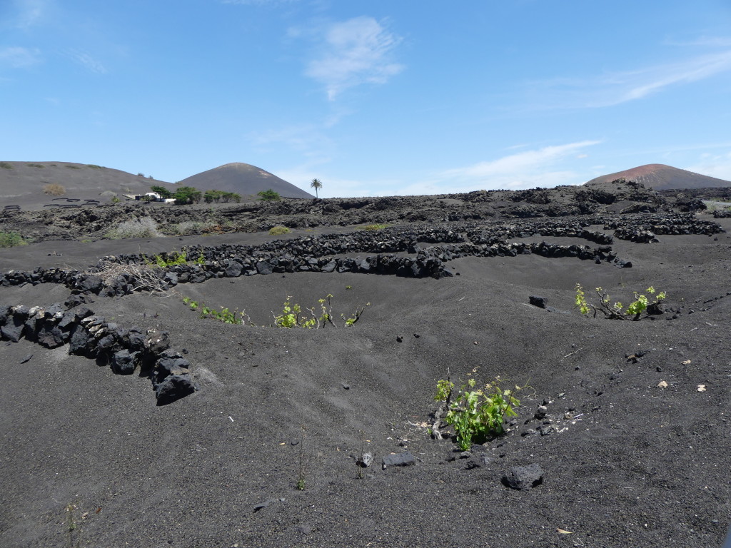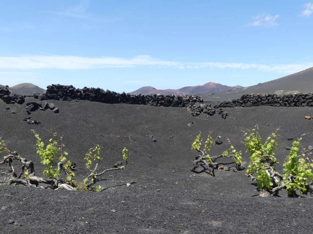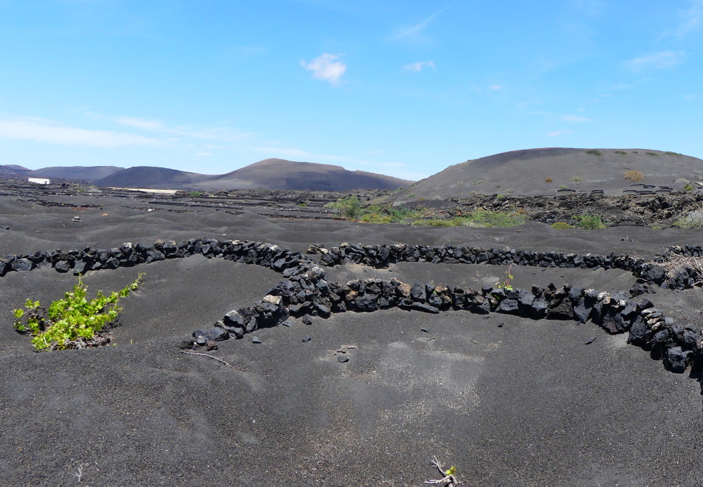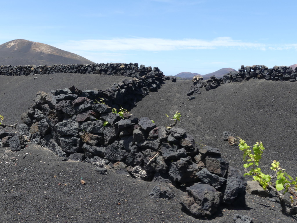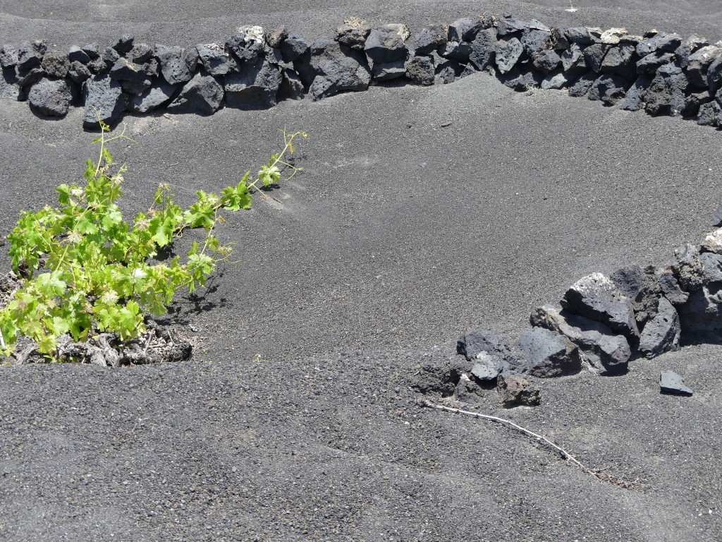 En effet, le sol basaltique, où poussent lesdits pieds, est non seulement recouvert de picon (gravier tiré de la pierre volcanique)  mais des murets de pierre volcanique sont, en outre, construits, en ligne droite,  en cercles ou demi cercles, autour de ces derniers (plantés au centre de grandes alvéoles) afin de les protéger  du vent (lequel peut souffler très fort comme je l’ai moi-même appris à mes dépens).