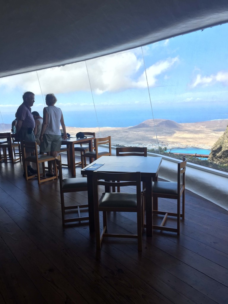 Construit (en 1973) au sommet d’une falaise située à la pointe nord de Lanzarote, le Mirador del Rio, associant verre et roche,  m’a laissée un souvenir impérissable.